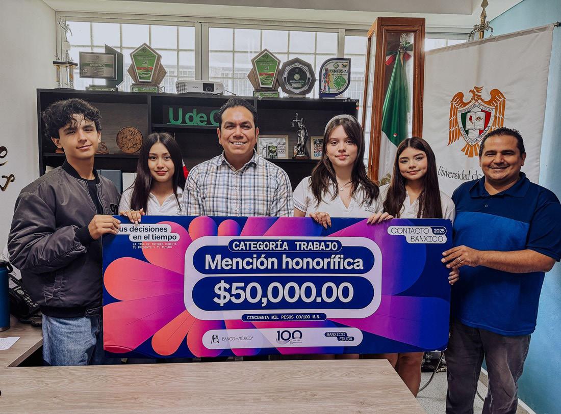 Cuatro estudiantes del Bachillerato 4 de la Universidad de Colima (UdeC), acompañados por su asesor José Augusto Lozano Becerra, recibieron una Mención Honorífica por su destacada participación en el Premio Contacto Banxico 2025, certamen nacional que impulsa la educación financiera y el dominio de conceptos económicos entre jóvenes del nivel medio superior.