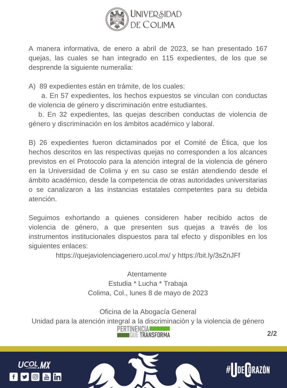 Mediante un comunicado de prensa difundido en sus perfiles oficiales de redes sociales, la Universidad de Colima dio a conocer que fue rescindido el contrato de un profesor acusado de acoso sexual por una trabajadora; además, detalla que de enero a abril de 2023 ha recibido 167 quejas, las cuales han integrado en 115 expedientes.