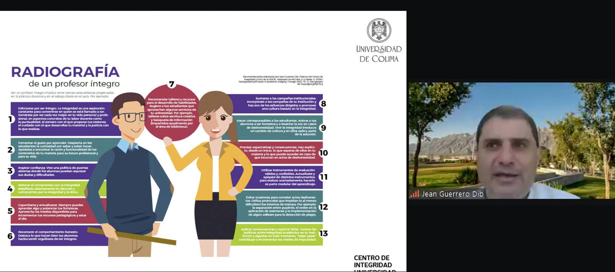 tiempo completo de la Facultad de Telemática, dijo que a partir del retorno presencial a las aulas, “los docentes y estudiantes estamos motivados en lograr el máximo aprovechamiento académico, y para ello la integridad académica tiene un papel esencial; debemos ser conscientes de que los estudiantes son grandes observadores del