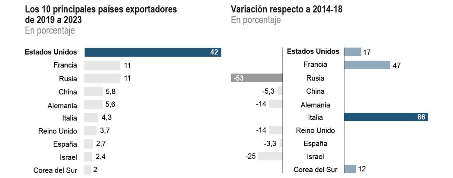 Sólo otros 2 países de entre los 10 primeros aumentaron sus ventas en 2019-23: Italia (sexta), con un 86% más; y Corea del Sur (décima), con un 12% más, mientras el resto (China, Alemania, Italia, Reino Unido, España e Israel) sufrió retrocesos. India, primer comprador mundial