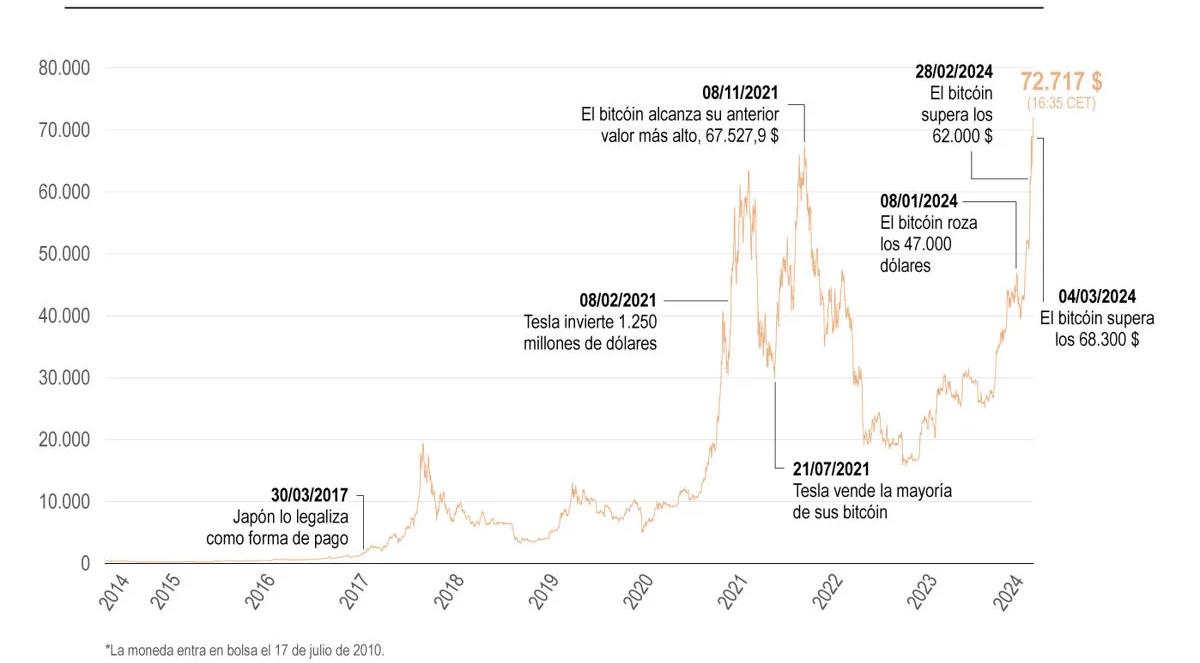 La criptomoneda más conocida ha tocado los 72,717.25 dólares a las 16:35 horas, según datos de Bloomberg, lo que supone un nuevo récord.