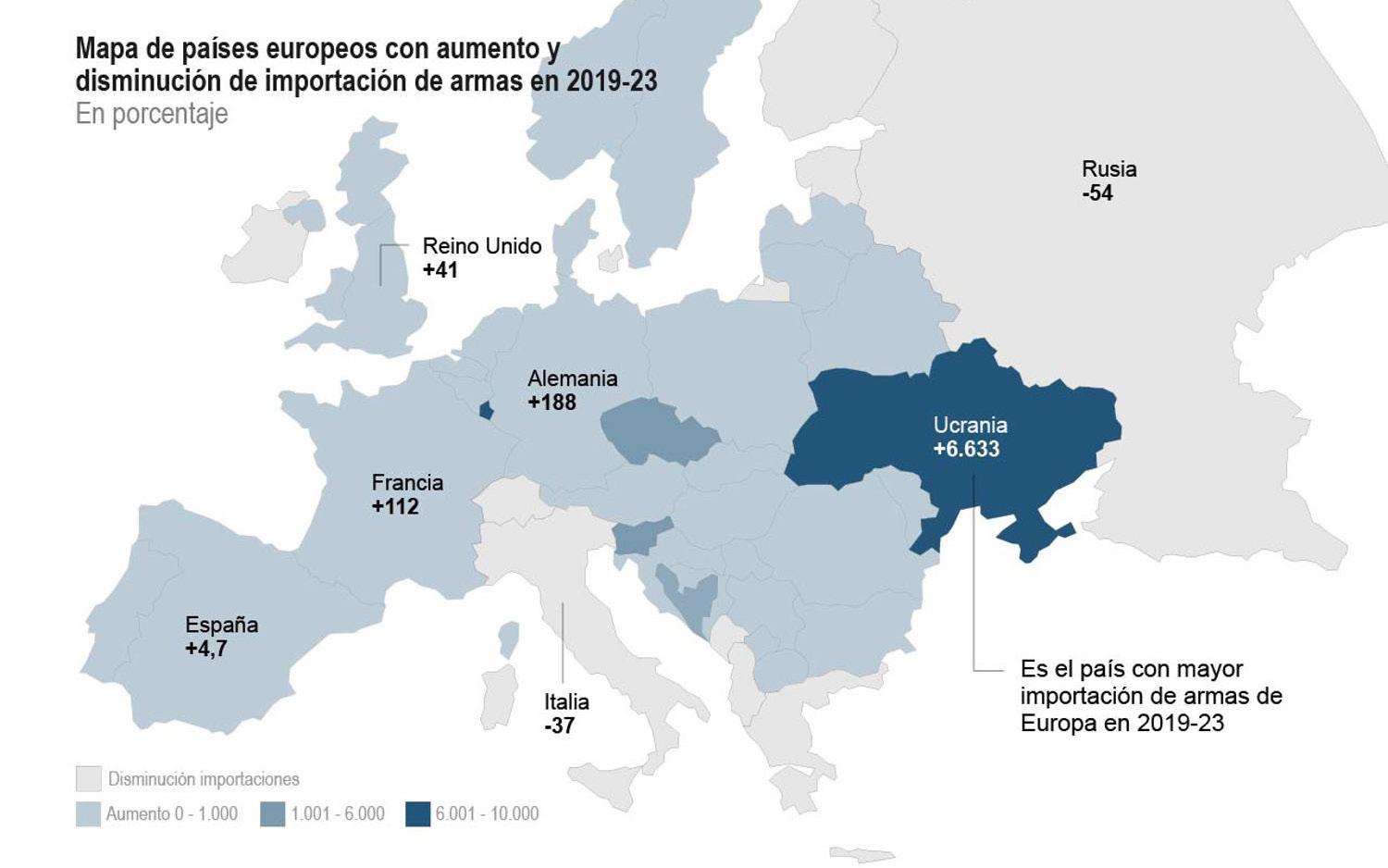 Aunque el comercio mundial de armamento se contrajo un 3.3% en el último lustro, el conflicto en Ucrania provocó que las compras subiesen un 94% en Europa, que aumentó su dependencia respecto a Estados Unidos (del 35% al 55% del volumen total adquirido).