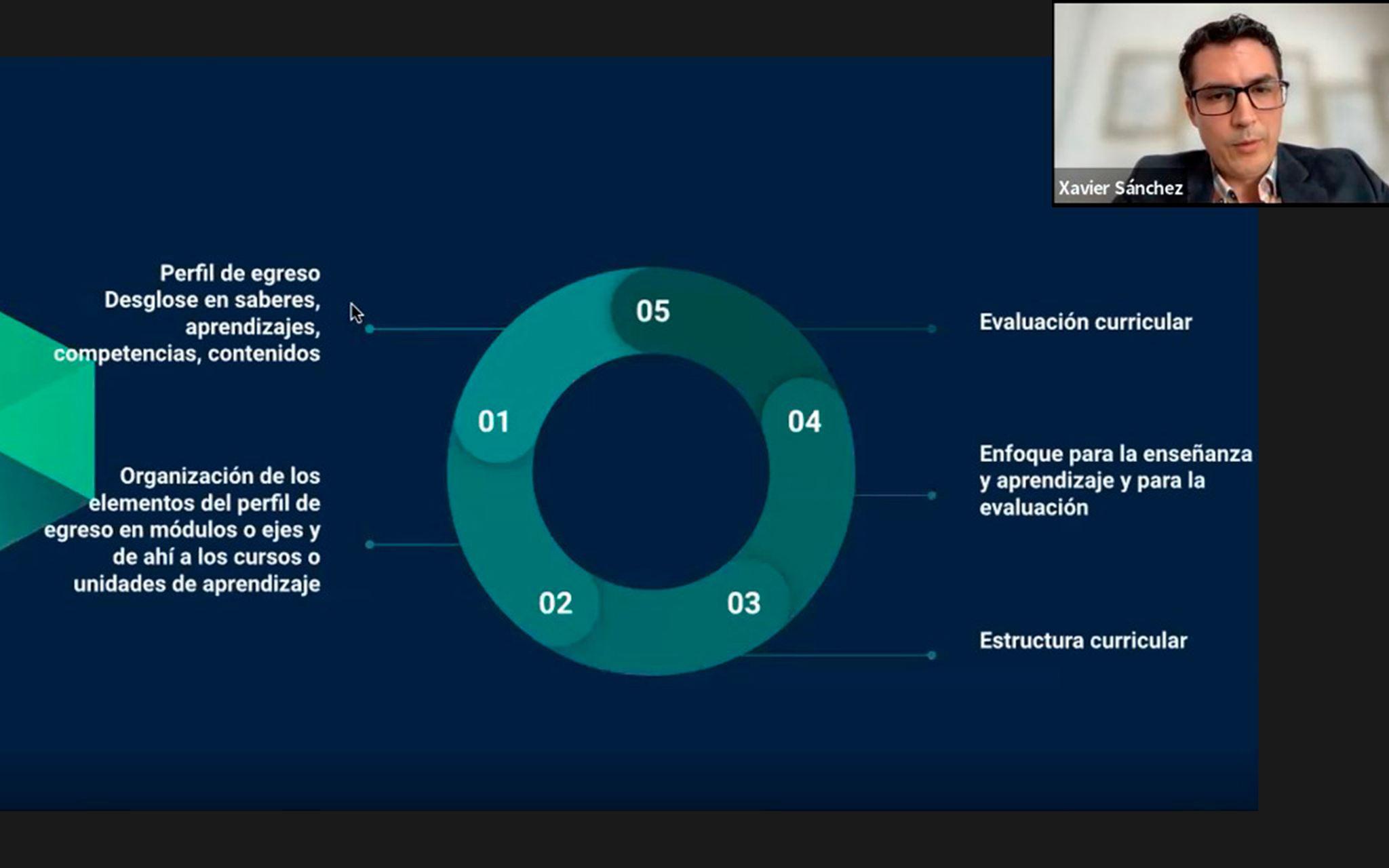 El doctor Xavier Sánchez Guzmán, de la Universidad de Guadalajara (UdeG), explicó que un diseño curricular tiene el siguiente orden y los siguientes elementos: diagnóstico, perfil de egreso, organización de los elementos del perfil de egreso, estructura curricular, enfoque para la enseñanza aprendizaje y para la evaluación y evaluación curricular.