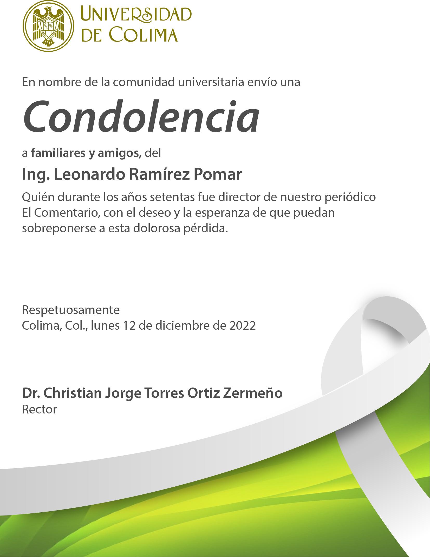 Falleció el ingeniero José Leonardo Ramírez Pomar, quien a finales de la década de los 70, fue el quinto director del periódico El Comentario, sustituyendo en el cargo al licenciado Javier Valdovinos Collado.