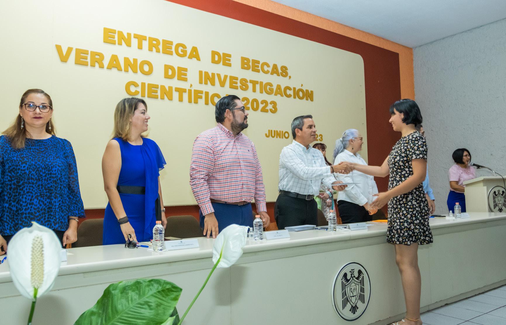Para impulsar la formación de capital intelectual de alto nivel académico que en el futuro inmediato contribuya al desarrollo regional, nacional e internacional, en el auditorio de la Biblioteca de Ciencias, el Rector Christian Jorge Torres Ortiz Zermeño entregó 83 becas a las y los estudiantes que resultaron elegidos para hacer movilidad en el XXVIII Verano de la Investigación Científica y Tecnológica del Programa Delfín 2023.