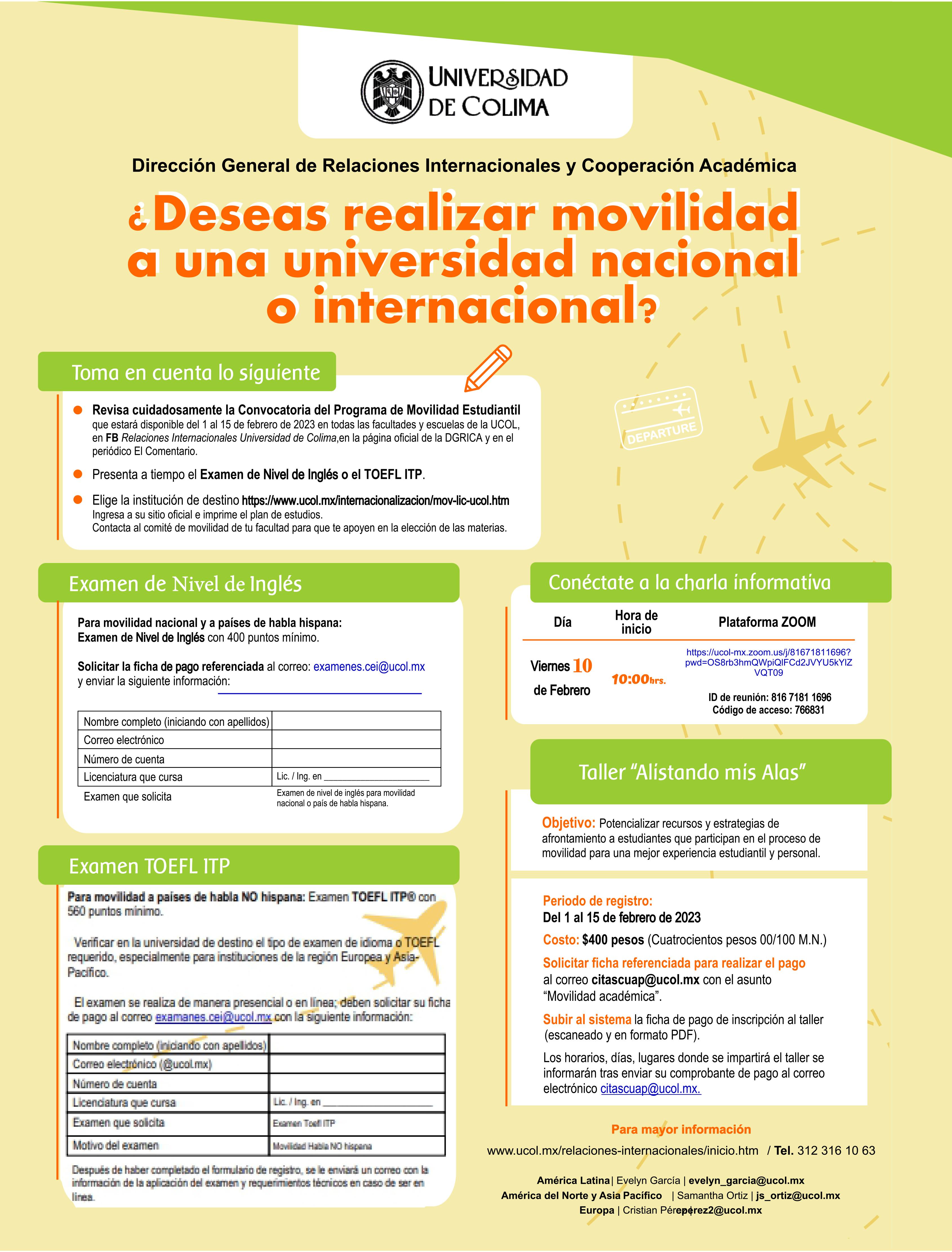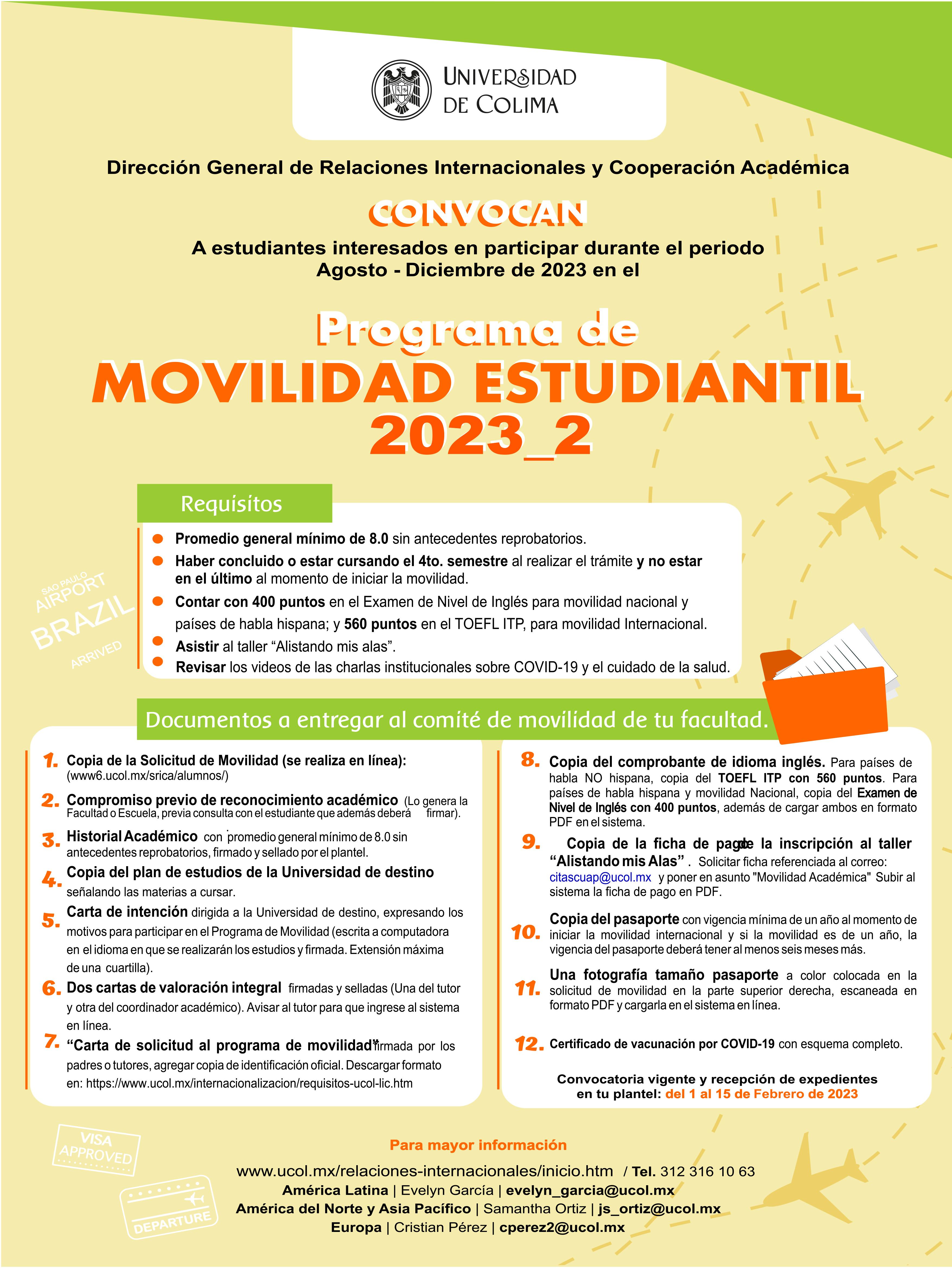 - Categoría Única (correspondiente a estudiantes de nivel medio superior de la Universidad de Colima) quienes podrán participar con una fotografía informativa o que re eje un hecho noticioso de interés público. La fotografía se enviará al correo andanteucol@gmail.com a más tardar al 28 de febrero de 2023 a las 11:59 hrs. Agregar nombre completo, bachillerato de procedencia, número telefónico de contacto y número de estudiante.