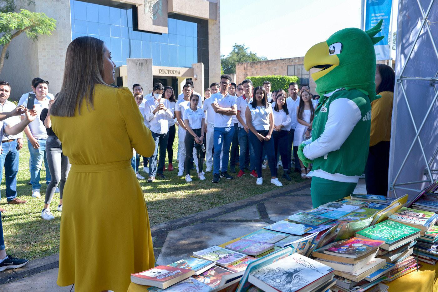 Los primeros 100 libros fueron entregados a Soraya Araceli Acuña Martínez, presidenta de la Asociación Mexicana de Ayuda a Niños y niñas con Cáncer (AMANC Colima), por parte de Blanca Liliana Díaz Vázquez, presidenta del Voluntariado Universitario y por Camilo García Morales, presidente de la Federación de Estudiantes Colimenses.