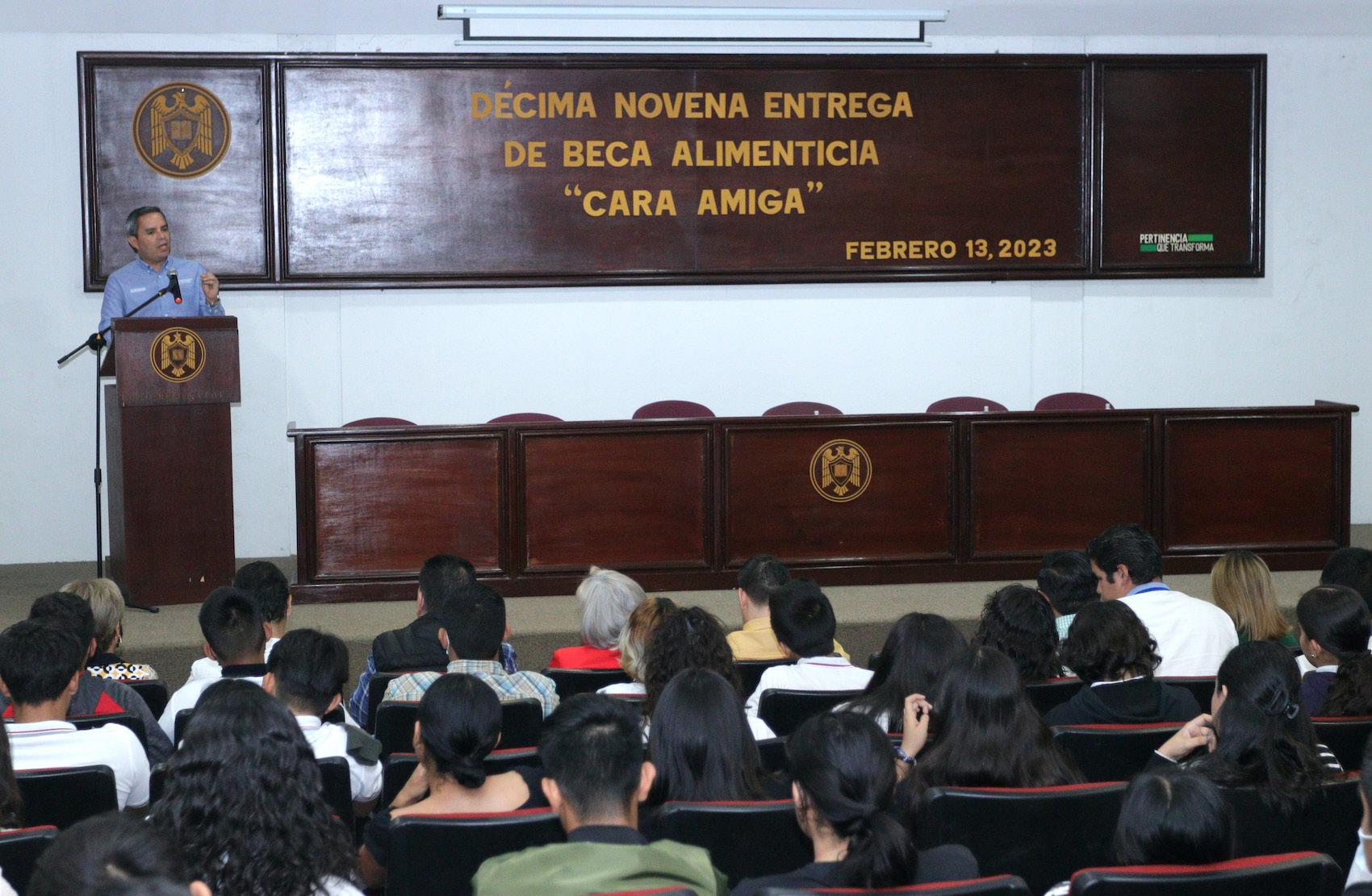 En un acto celebrado este lunes (13) en la Facultad de Ciencias de la Educación, 167 estudiantes de bachillerato y licenciatura de la Universidad de Colima recibieron la Beca Alimentaria Cara Amiga, que otorga una comida gratis durante los 76 días hábiles de un semestre, en cafeterías de todos los campus universitarios.