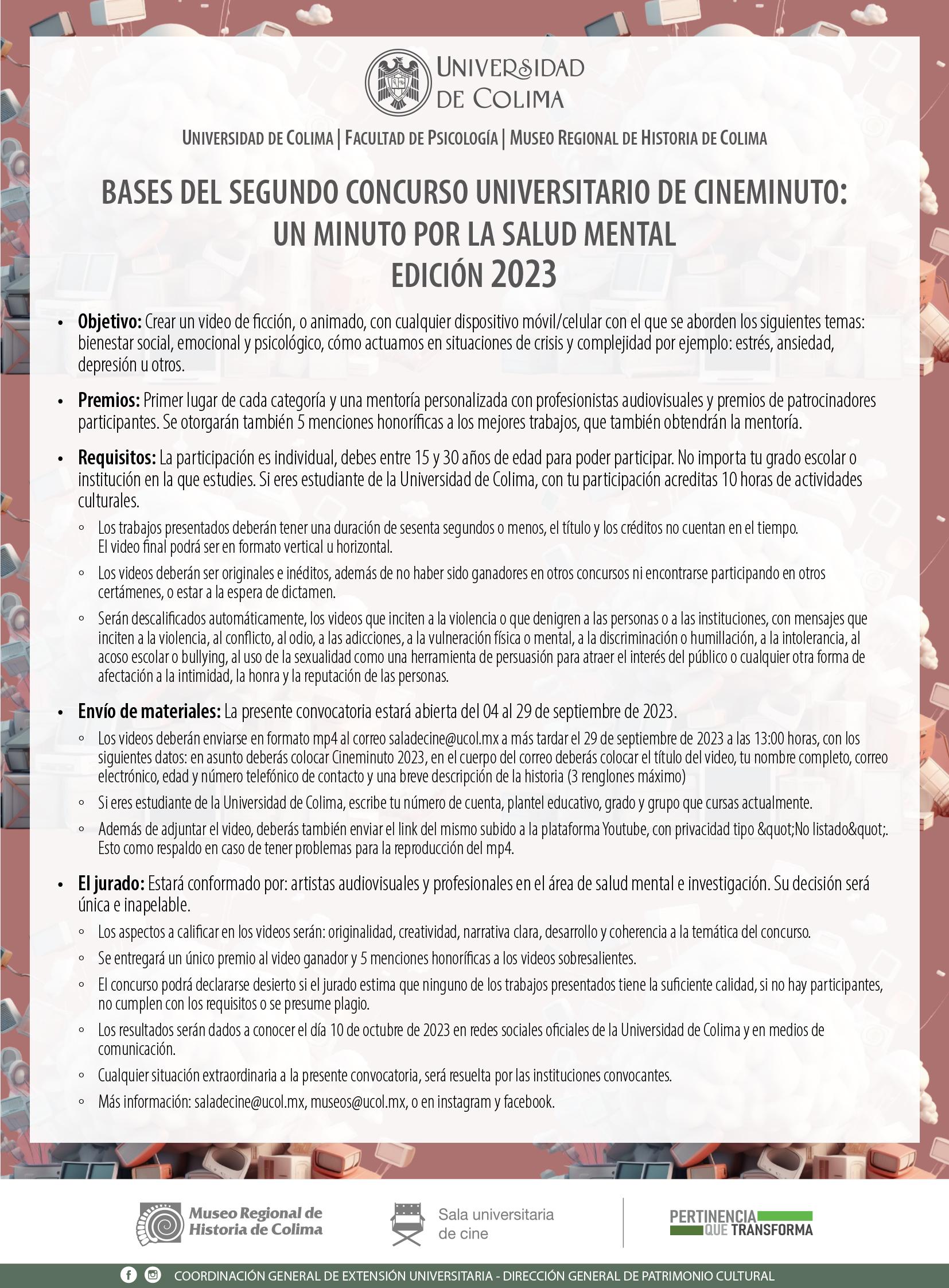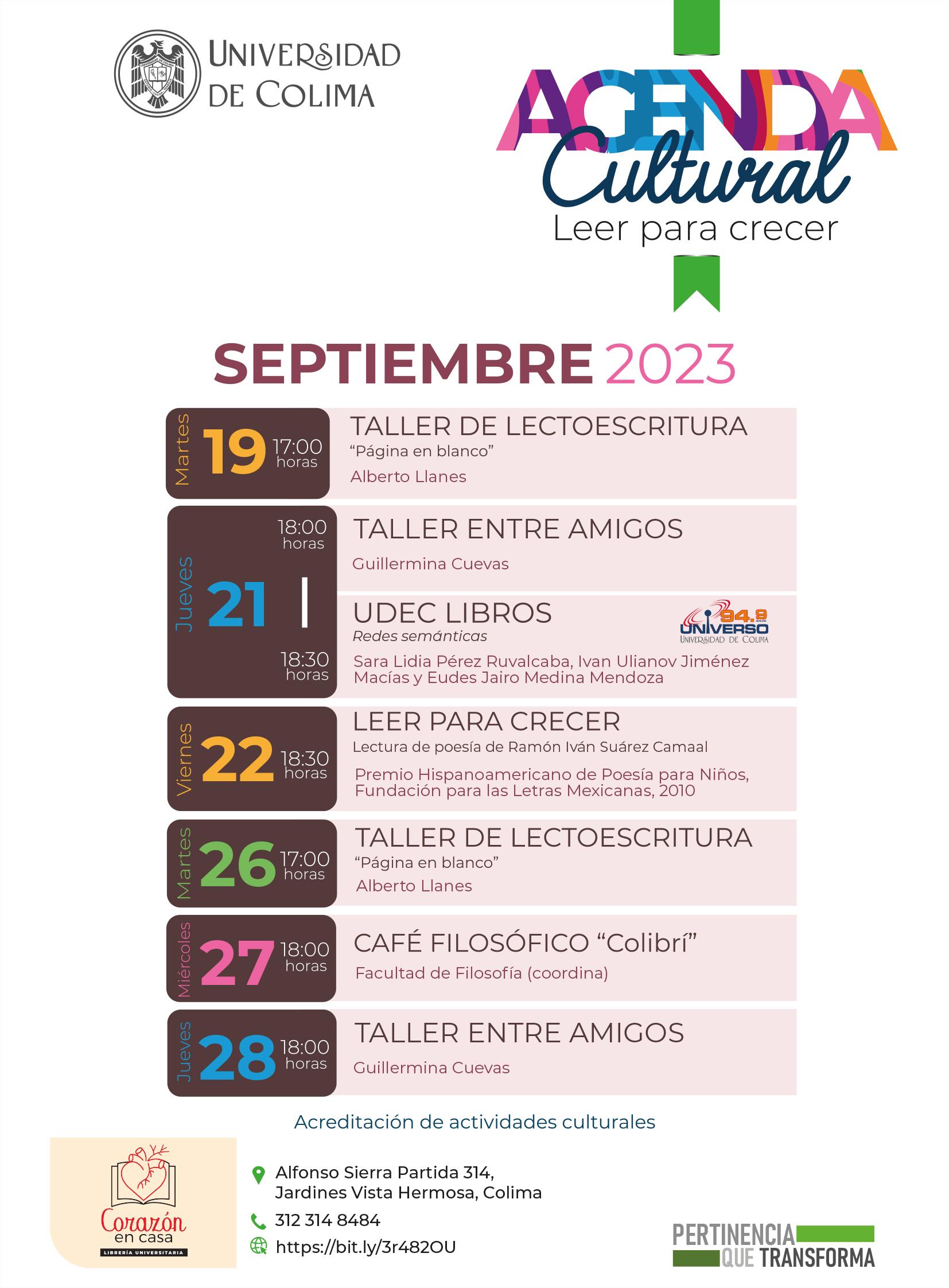 El jueves 19, a las 7 de la tarde, se efectuará el concierto “Nuestras voces por la Universidad”, con los grupos Cantares, Coral Femenina, el Coro del Ballet Folklórico, el Mariachi y Coralima, en el Teatro Universitario. El 21 de ese mismo mes, a las 11 de la mañana, se llevará a cabo la reapertura de la Casa del Volcán, que se localiza en el kilómetro 15 de la carretera que va de Villa de Álvarez a El Naranjal.