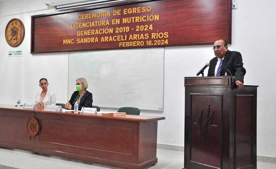 La coordinadora general de Docencia resaltó la formación integral que recibieron las y los egresados, capacitándolos en temas como servicios de alimentación, nutrición poblacional y clínica, metabolismo, fisiología y química de los alimentos, diseño y ejecución de proyectos de intervención, atención a personas sanas y con enfermedades, entre otros.