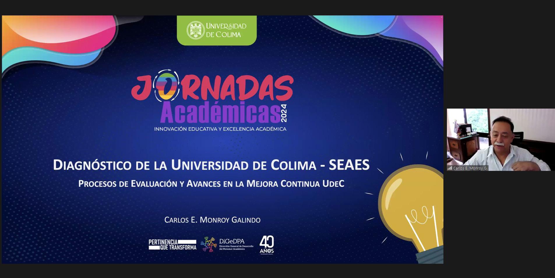 La conferencia inaugural estuvo a cargo de Eduardo Monroy Galindo, secretario técnico de la UdeC. Abordó el tema de “Diagnóstico de la UdeC en el SEAES”, donde compartió algunos resultados de la autoevaluación realizada el año pasado, propuesta a nivel nacional por el nuevo Sistema de Evaluación y Acreditación de la Educación Superior (SEAES). Explicó que la Nueva Ley de Educación Superior de 2021 incluye temas para todas las Instituciones de Educación Superior, públicas y privadas, motivo por el cual se crearon el Consejo Nacional de Coordinación de la Educación Superior (CONACES) y el Sistema de Evaluación y Acreditación de la Educación Superior (SEAES).