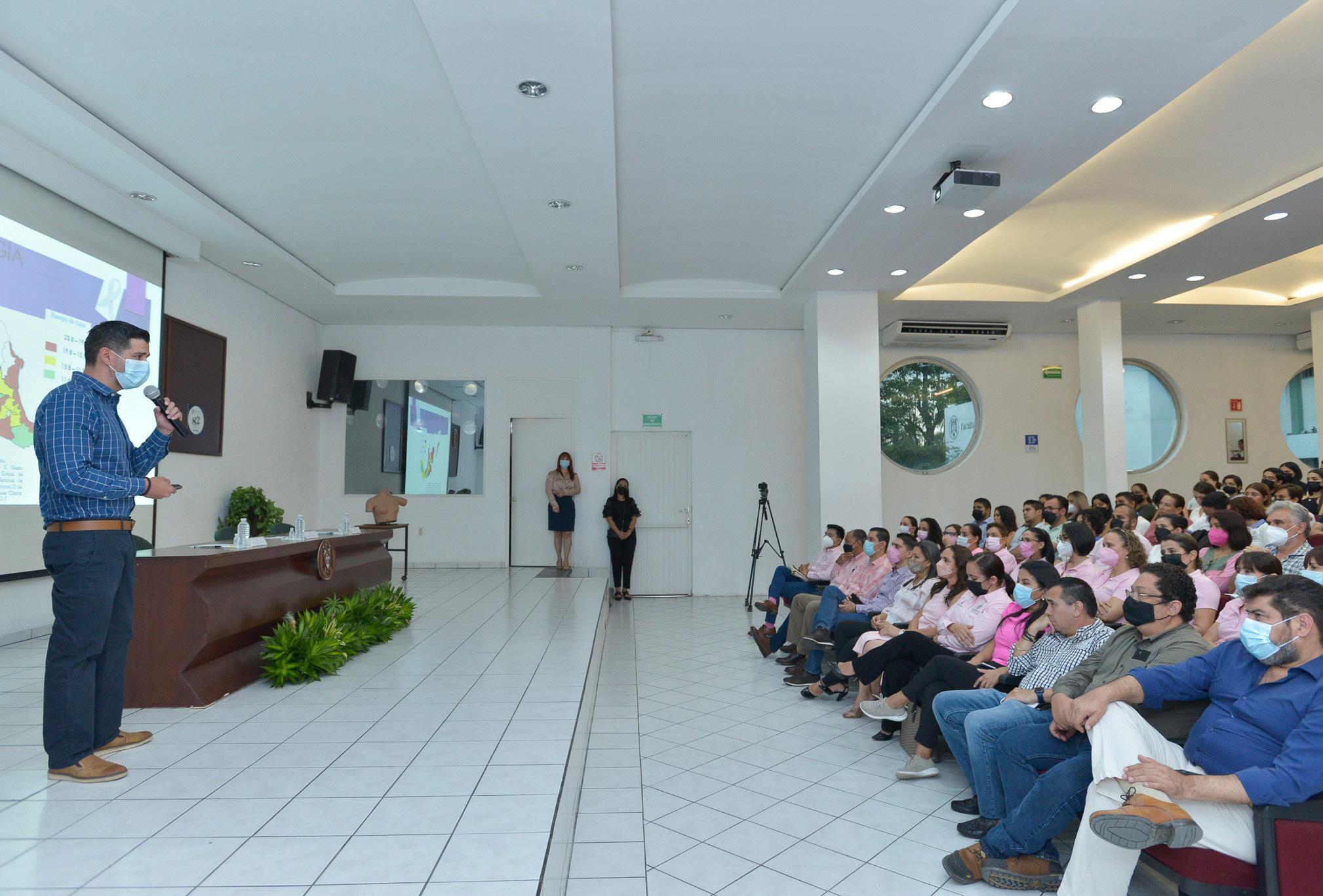 Esto lo comentó el oncólogo Fernando Moreno Ceballos al dictar la conferencia “Generalidades sobre el diagnóstico y tratamiento del cáncer de mama”, en el auditorio de la Facultad de Enfermería de la Universidad de Colima, en el marco de las actividades por el Día Internacional de la Lucha contra el Cáncer de Mama organizadas por el Voluntariado Universitario.