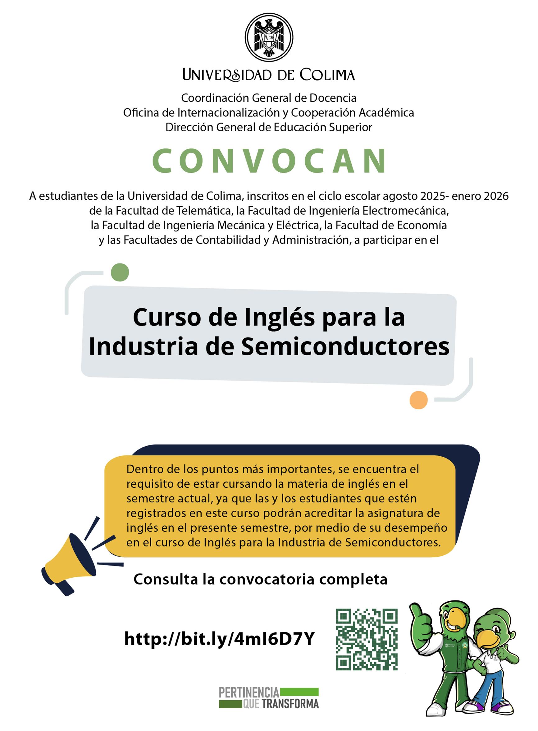 La Coordinación General de Docencia, la Oficina de Internacionalización y Cooperación Académica y las direcciones generales de Educación Media Superior y Superior de la Universidad de Colima lanzaron la convocatoria para el “Curso de inglés para semiconductores”. Este programa en línea está dirigido a profesionales y estudiantes, con el objetivo de brindarles competencias lingüísticas y vocabulario técnico especializado en inglés aplicable a la industria de los semiconductores.