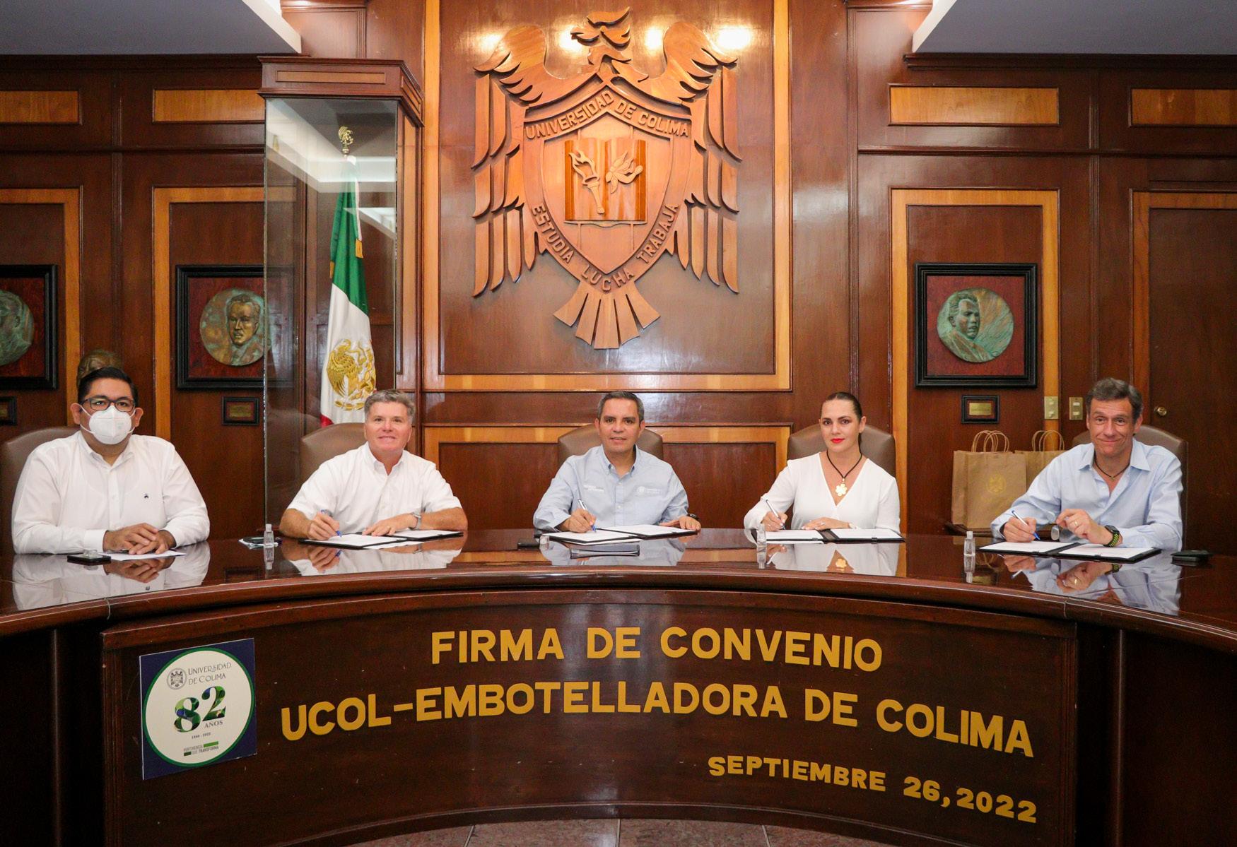 Con el propósito de realizar acciones conjuntas en materia de desarrollo comunitario, gestión ambiental y desarrollo sustentable, firmaron un convenio específico de colaboración la Universidad de Colima, representada por su Rector, Christian Jorge Torres Ortiz Zermeño, y la Embotelladora de Colima, que representa su director adjunto Francisco Brun González. Como testigos de honor firmaron Blanca Liliana Díaz Vázquez, presidenta del Voluntariado Universitario, y Jaime Cámara Creixell, fundador y director general de PetStar, empresa recicladora de pet.