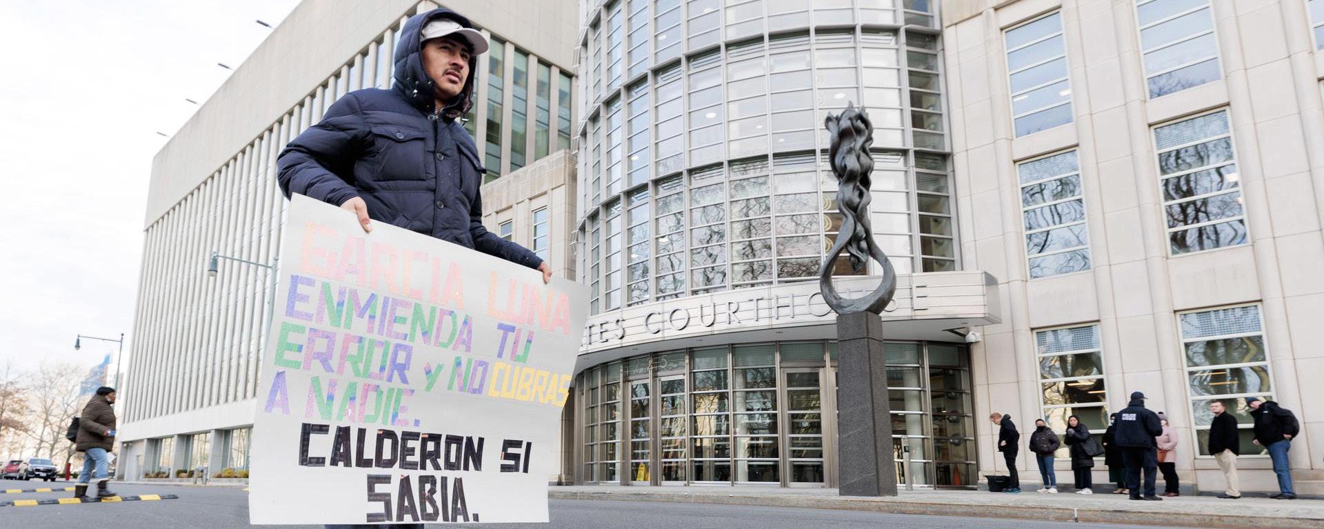 En el exterior del tribunal, un puñado de mexicanos se acercaron con carteles escritos a mano en los que pedían justicia con frases en español como: “García Luna, di la verdad”; “México exige justicia”; “García Luna, no cubras a nadie” o “Calderón sí sabía”, en alusión al expresidente Felipe Calderón, en cuyo gobierno sirvió el hoy procesado. Comparecen cada día