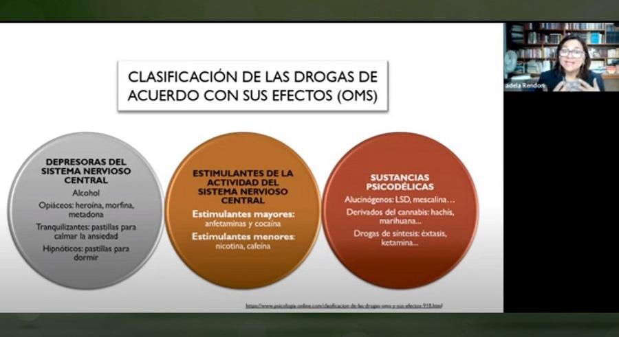 También mencionó los tipos de consumo, ya que no solamente el alcohol y el tabaco afectan al organismo. En este sentido, dio una clasificación de las drogas de acuerdo con sus efectos y su consumo. Con estadísticas, mostró que en México se incrementó el consumo de cocaína asociado al alcohol y que esto ha derivado en un problema de salud pública.