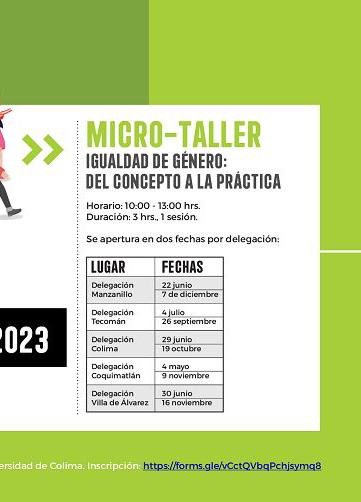 Añadió que el micro-taller “Igualdad de género: del concepto a la práctica” se impartirá en las 5 delegaciones con 2 fechas diferentes. El curso es de una sola sesión, con un horario de 10 de la mañana a 1 de la tarde, en modalidad presencial.