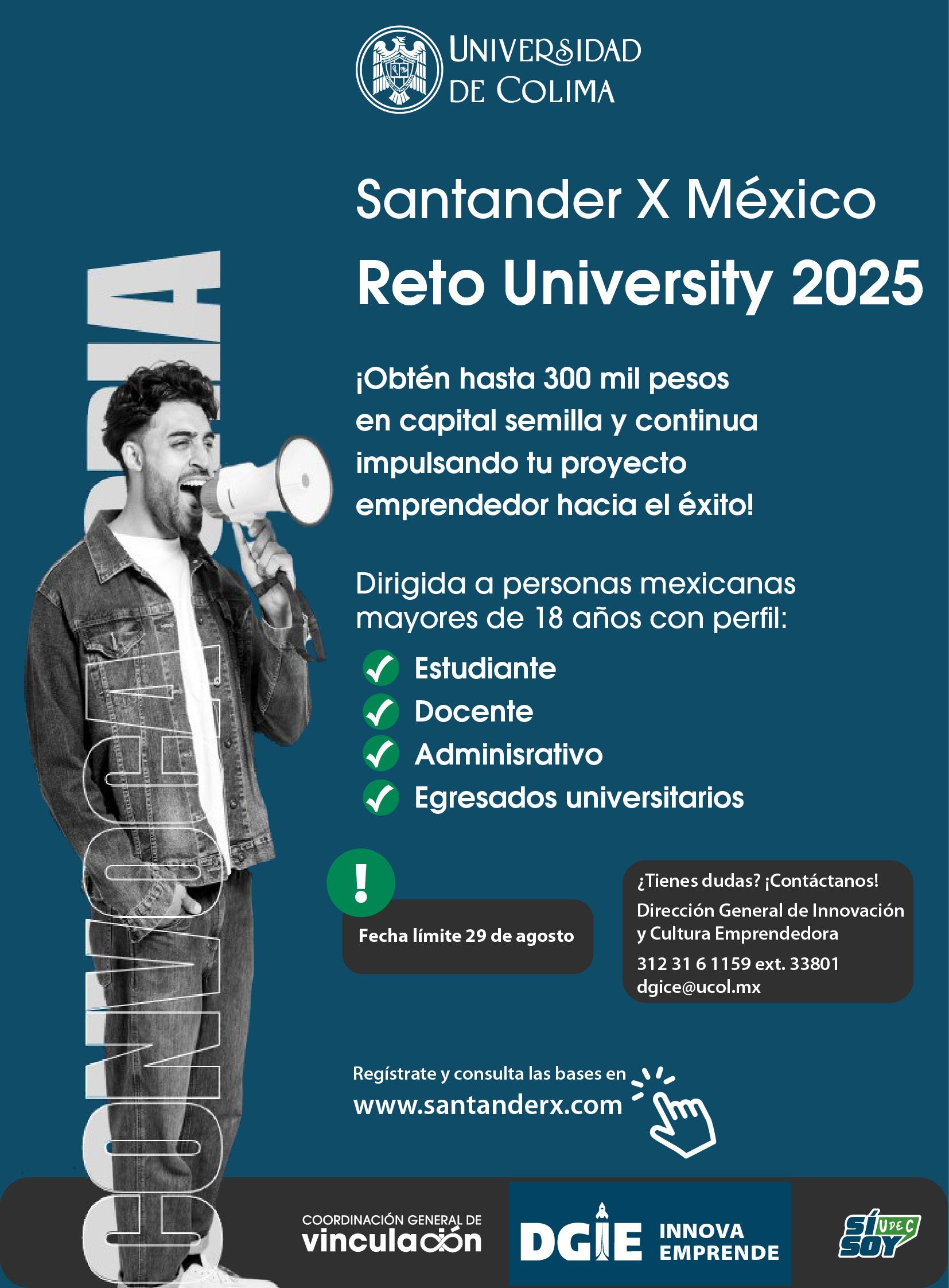 La Dirección General de Innovación y Cultura Emprendedora (DGIE) de la Universidad de Colima (UdeC), invita a participar en las convocatorias Santander X México, una plataforma del Banco Santander que se dedica a apoyar a emprendedores y la innovación en el país. Quienes se interesen en participar pueden hacerlo a través de 2 convocatorias Reto University, dirigido a estudiantes, egresados y docentes; y Reto Startup, pensado en