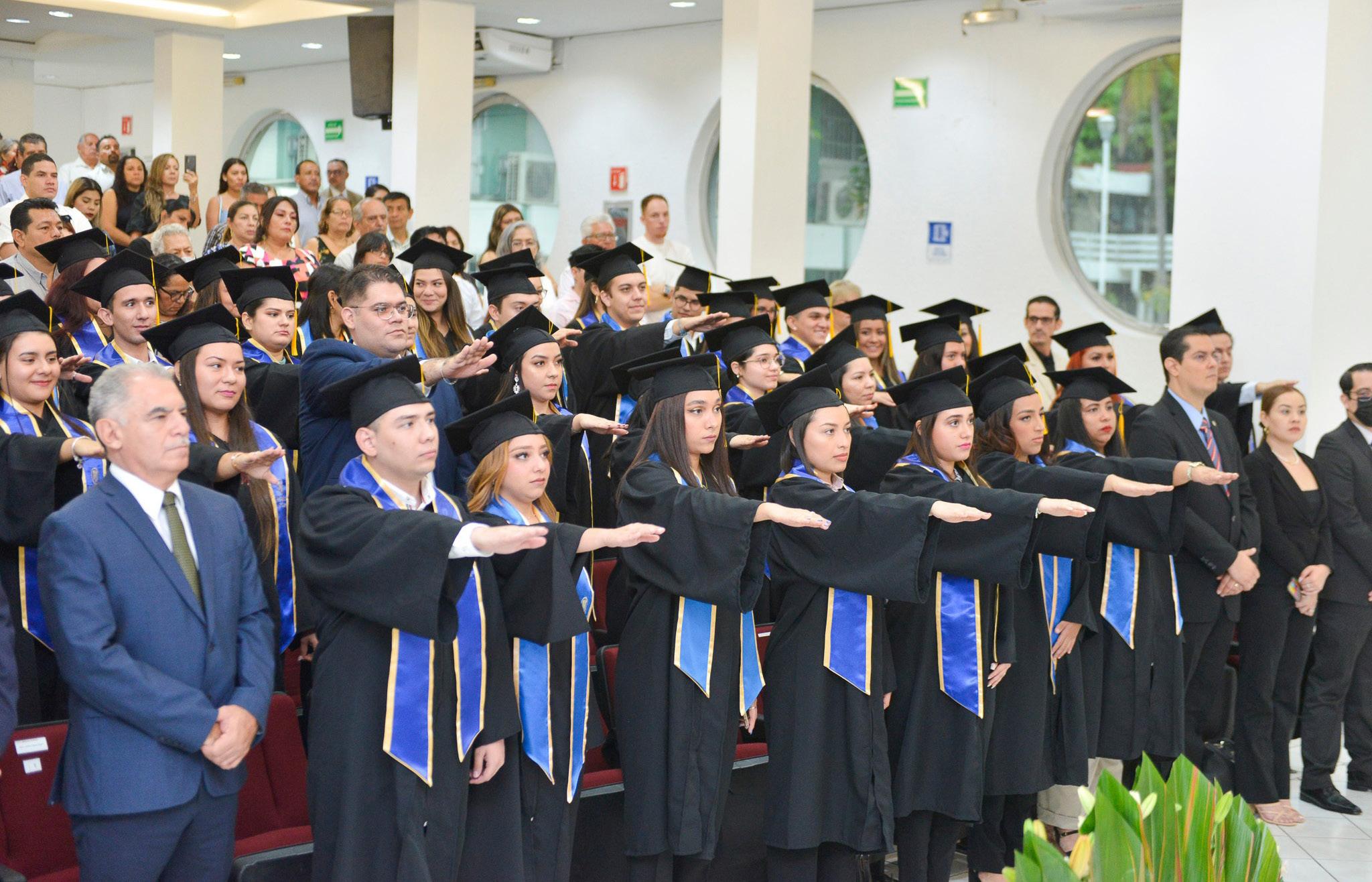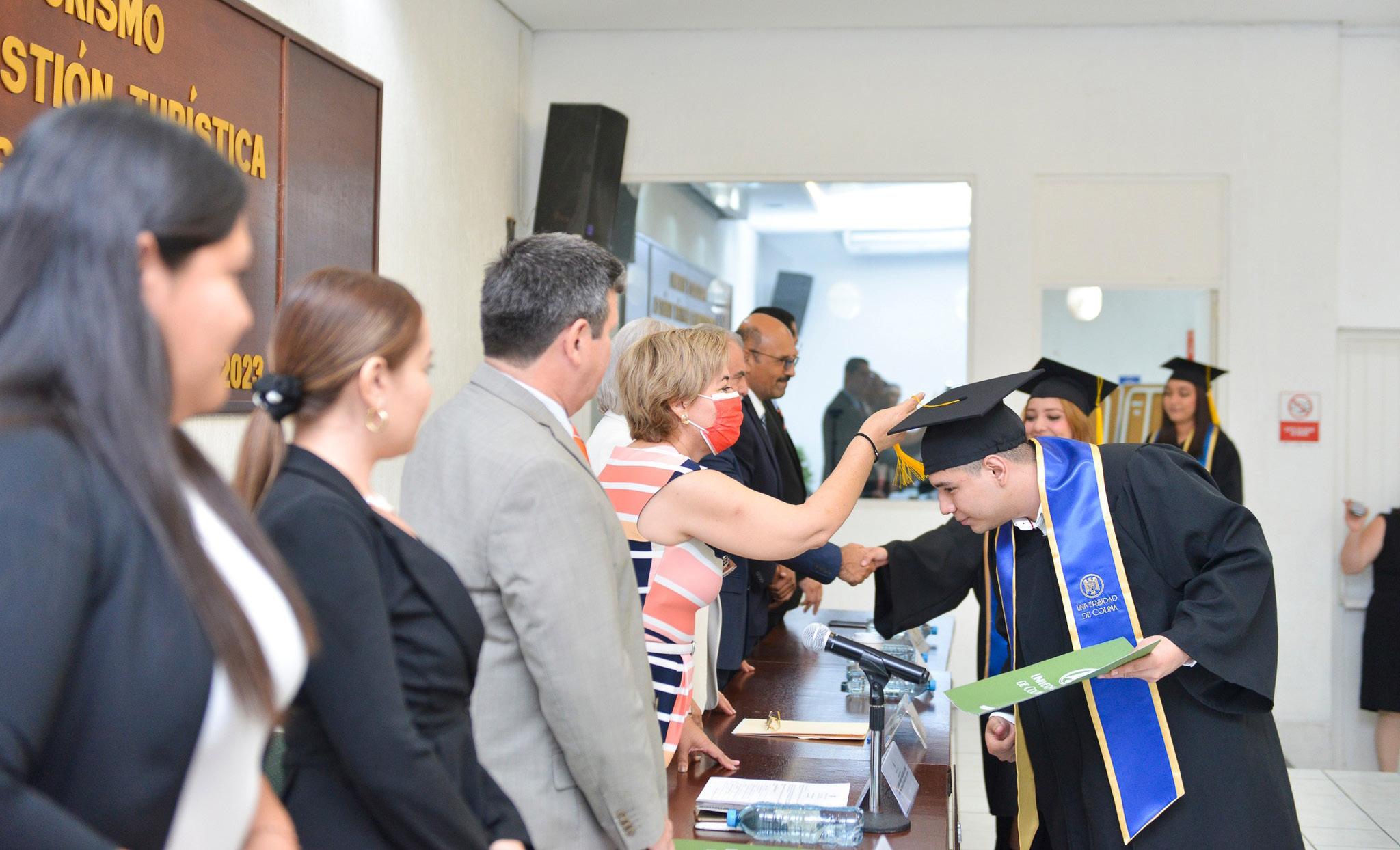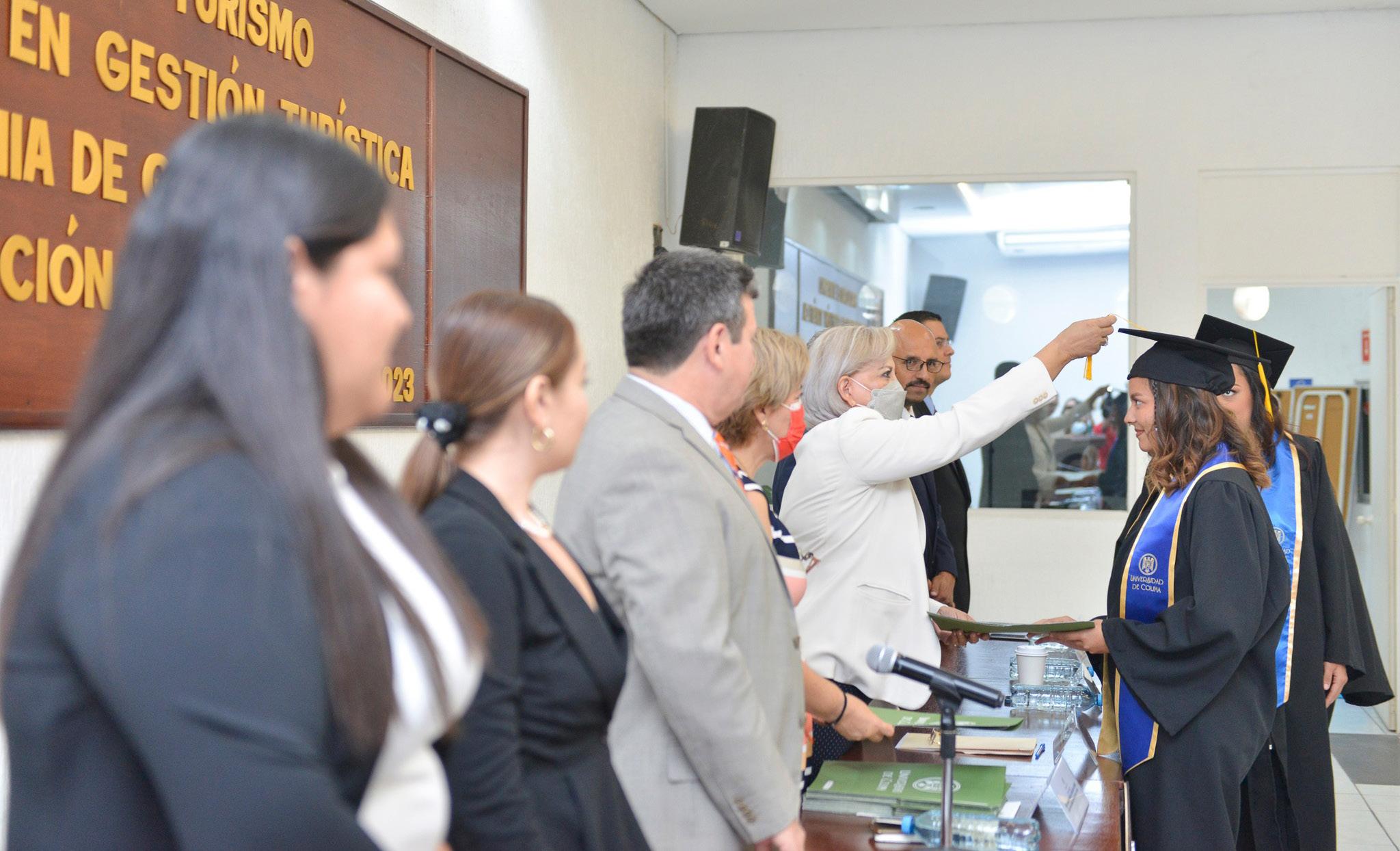 Por primera vez en la historia de la Facultad de Turismo, campus Villa de Álvarez, se titularon 31 jóvenes, de un total de 46, de la Licenciatura en Gestión Turística, generación 20182023, en un acto celebrado en el auditorio de Enfermería del campus central.
