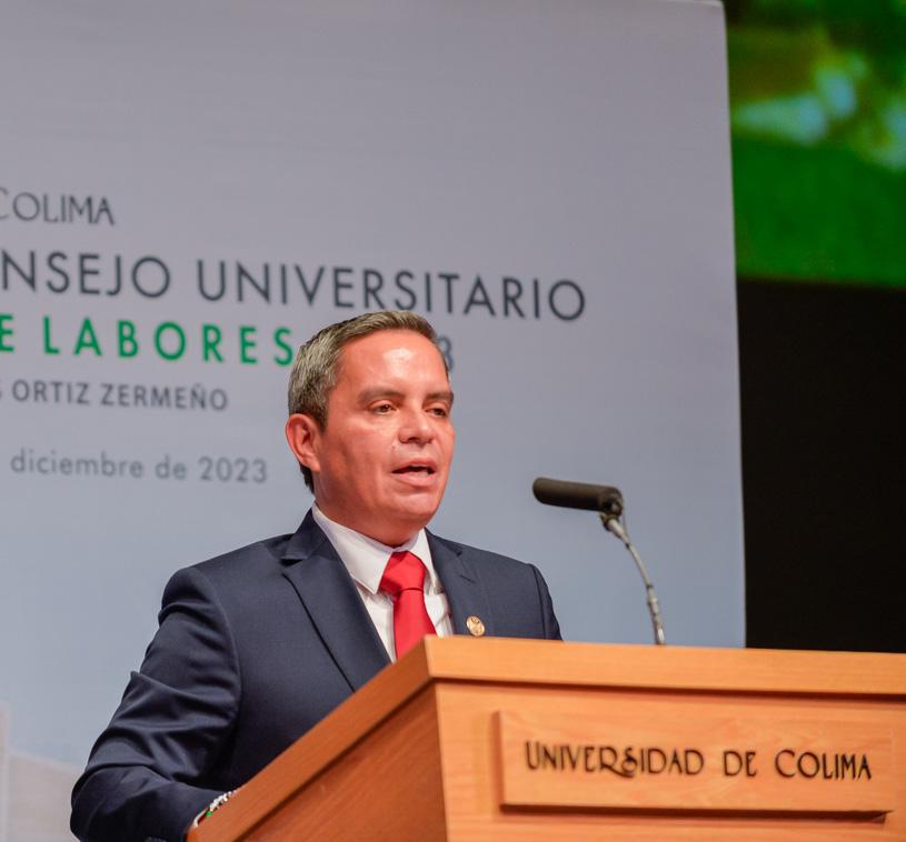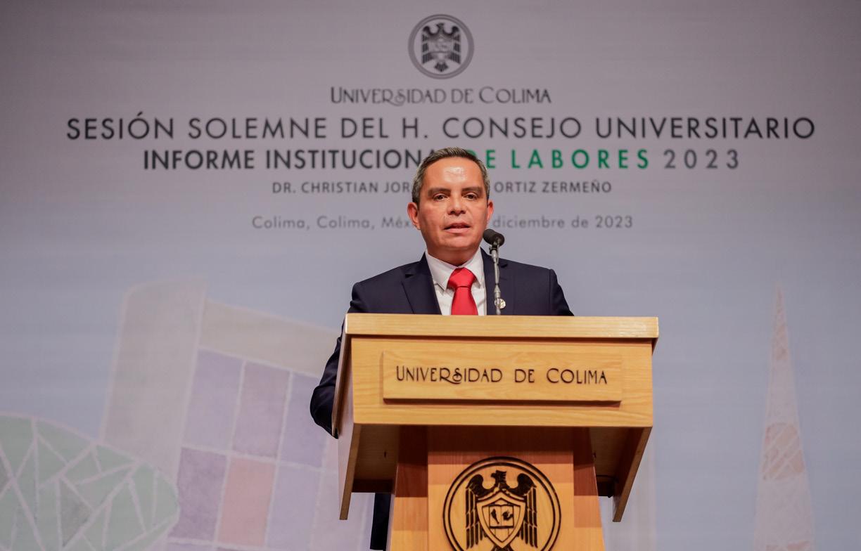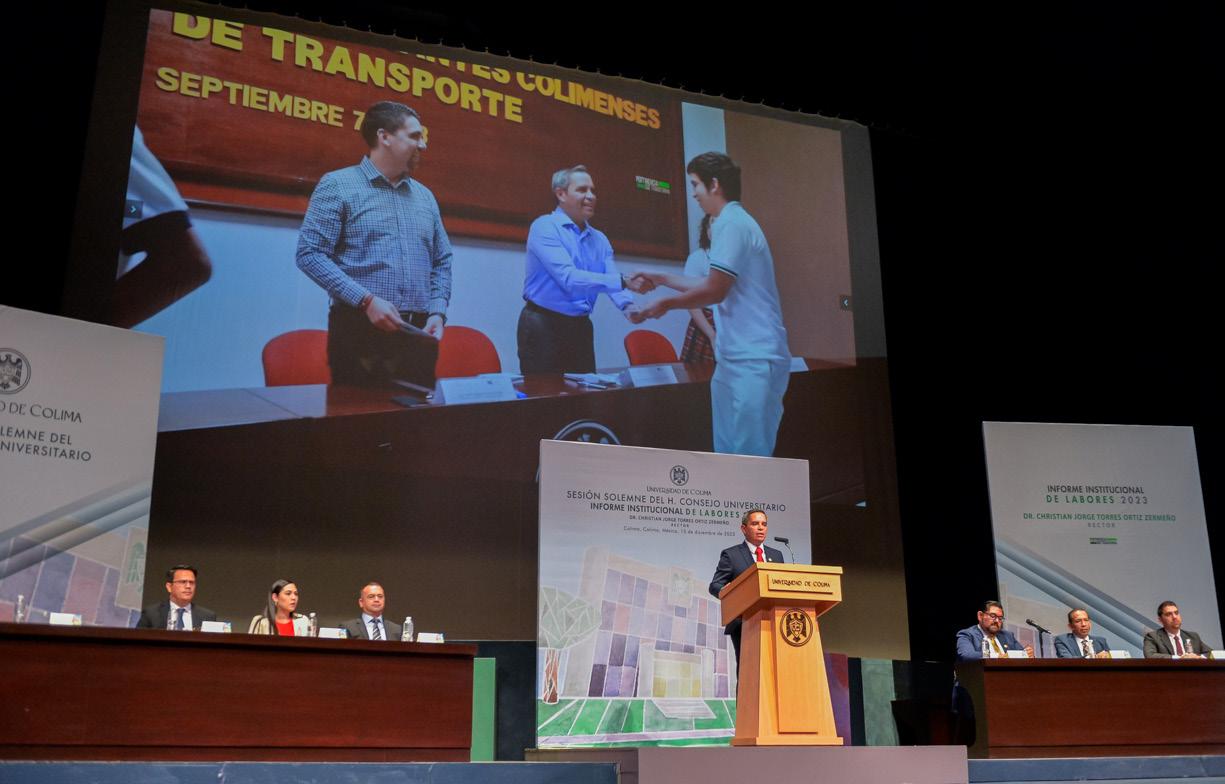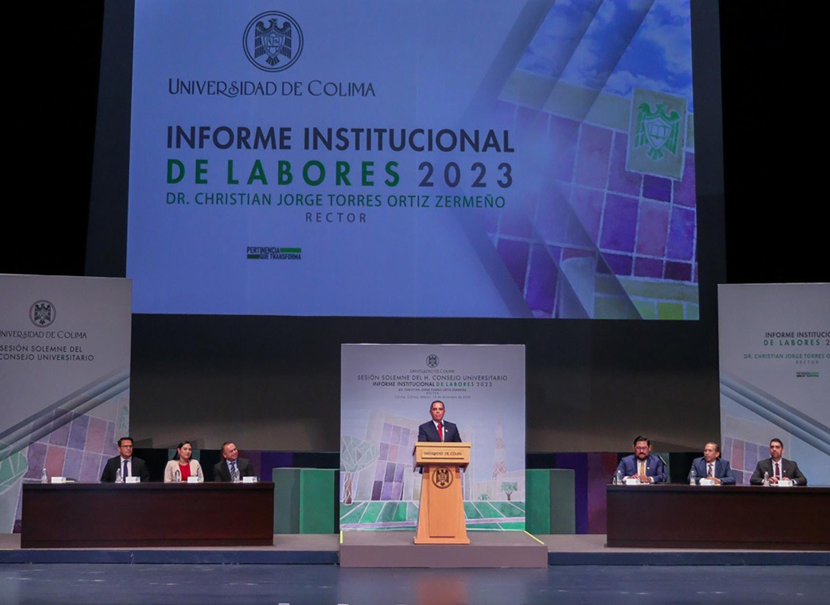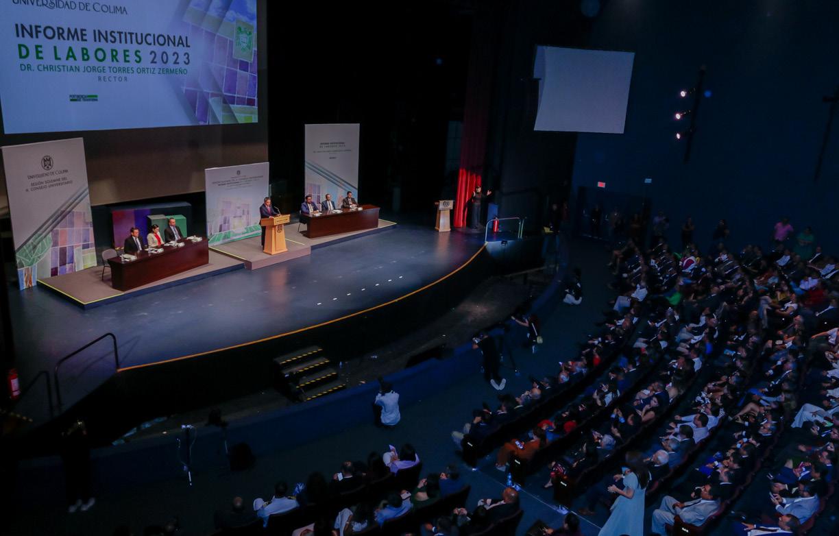 Ante un Teatro Universitario lleno de invitados y concejales integrantes del Consejo Universitario, máximo órgano de Gobierno de la Universidad de Colima, el Rector Christian Jorge Torres Ortiz Zermeño informó a la comunidad universitaria y a la sociedad en general sobre las acciones más importantes realizadas por la institución educativa a lo largo de este 2023.