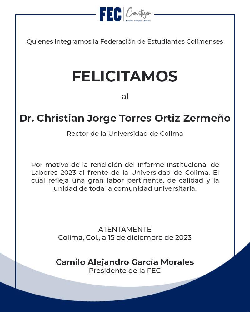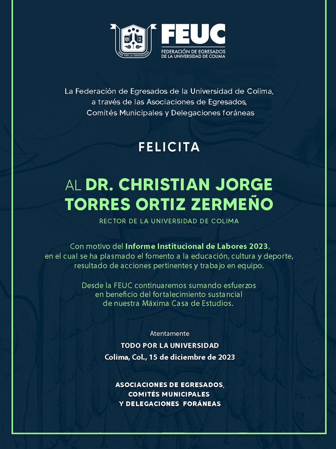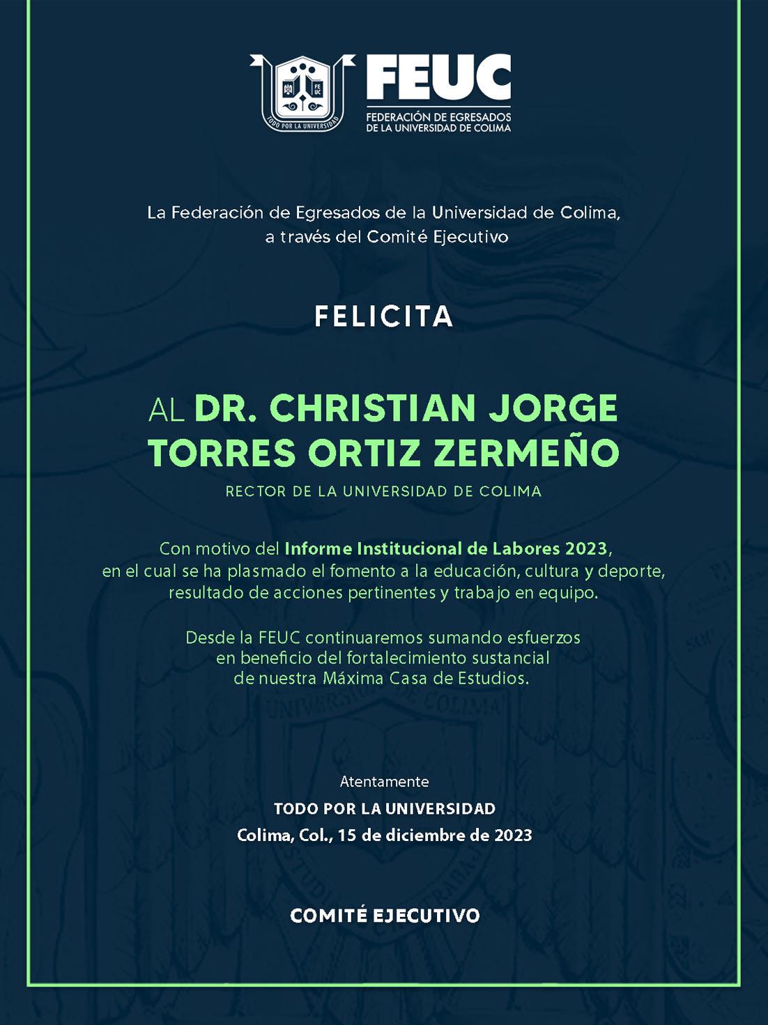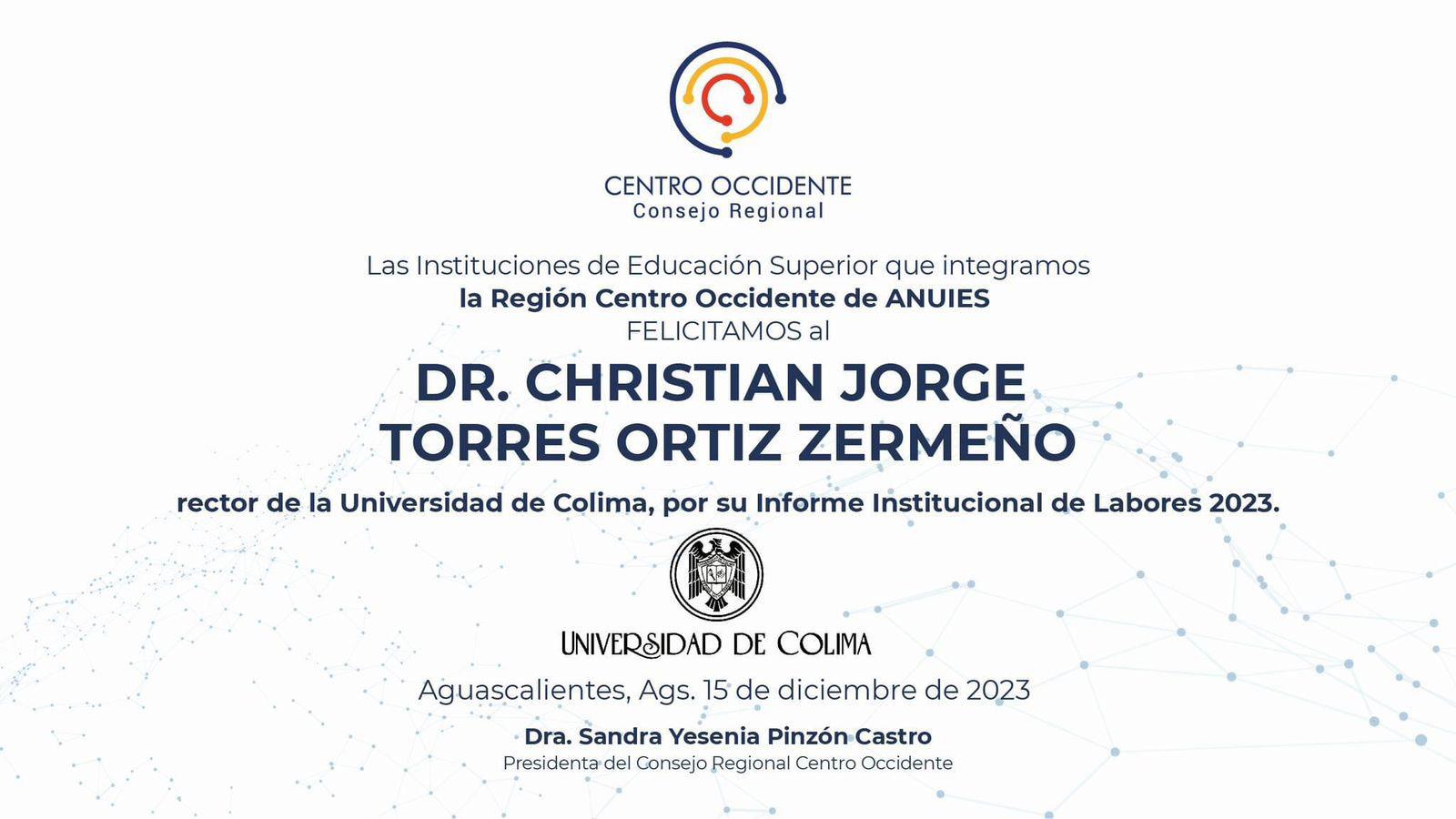 Ante un Teatro Universitario lleno de invitados y concejales integrantes del Consejo Universitario, máximo órgano de Gobierno de la Universidad de Colima, el Rector Christian Jorge Torres Ortiz Zermeño informó a la comunidad universitaria y a la sociedad en general sobre las acciones más importantes realizadas por la institución educativa a lo largo de este 2023.