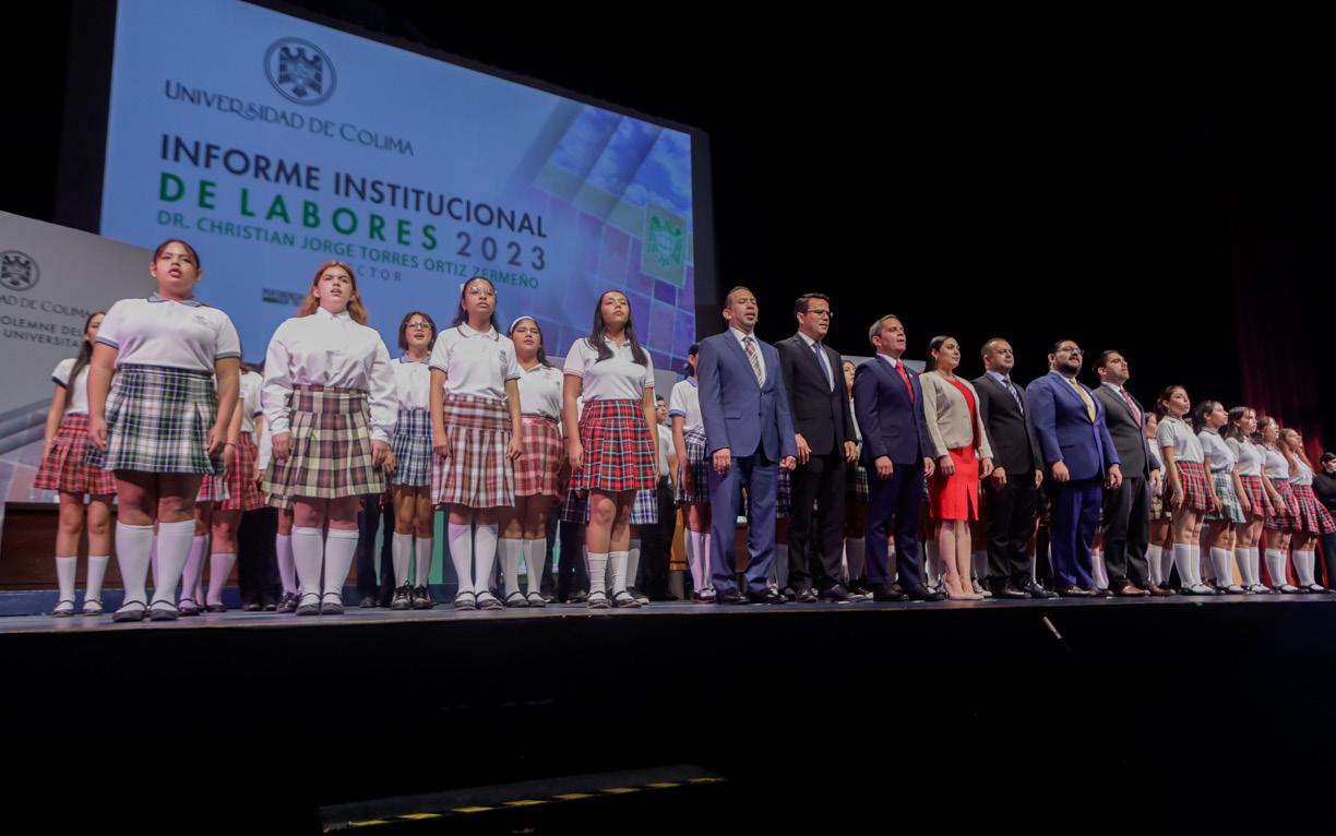 Esta rendición de cuentas fue presidida por la gobernadora Indira Vizcaíno Silva, quien se disculpó con las y los universitarios, ya que por recomendación médica debía cuidar su garganta. En su mensaje, que incluyó un video con las cifras de los logros y avances de la Casa de Estudios, el Rector dijo que, en sus 83 años de historia, la Universidad de Colima “ha forjado una sólida relación con la sociedad, como la institución más importante para la formación de ciudadanía a través de la educación, la investigación y la extensión; nuestro compromiso trasciende las aulas, porque evolucionamos según las necesidades de la entidad, la región y el país, en el marco histórico de las leyes y postulados de la educación media superior y superior en México”.