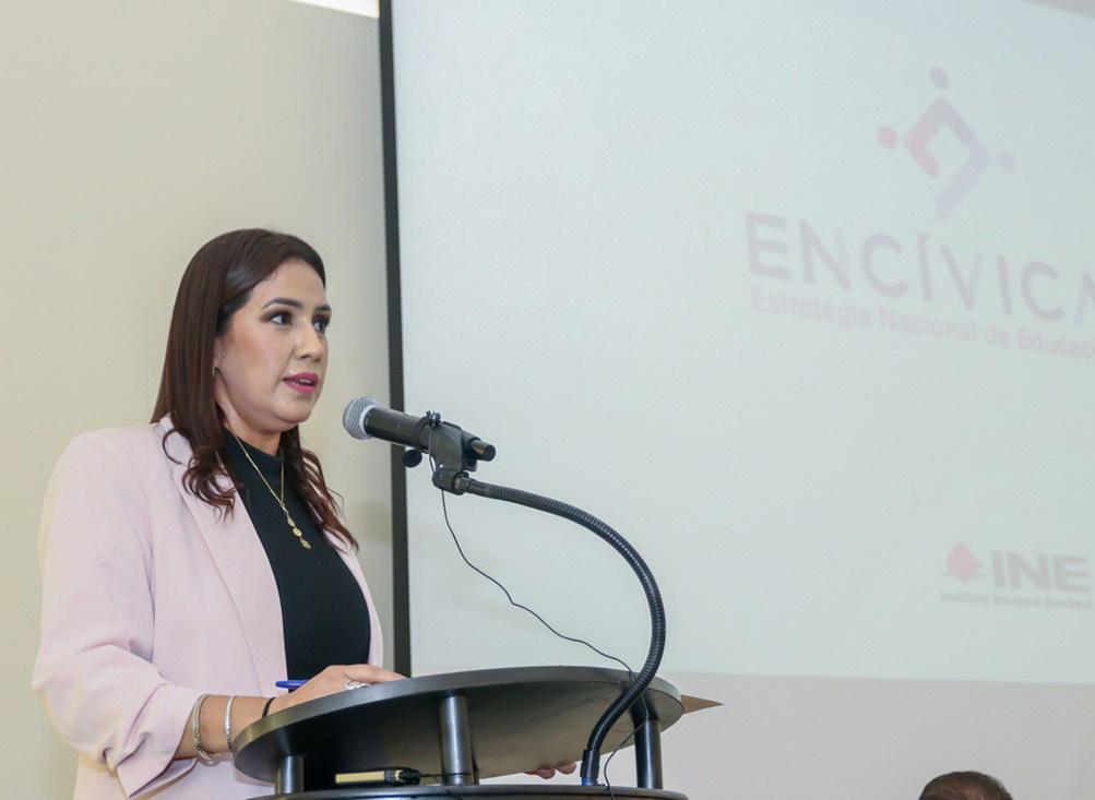 Por último, Laura Cecilia Barragán González, vocal de Capacitación Electoral y Educación Cívica de la Junta Local Ejecutiva del INE, habló con detalle de las estrategias que incluyen la implementación de 24 acciones operativas alineados a 2 ejes estratégicos que contempla la aplicación de la ENCÍVICA.