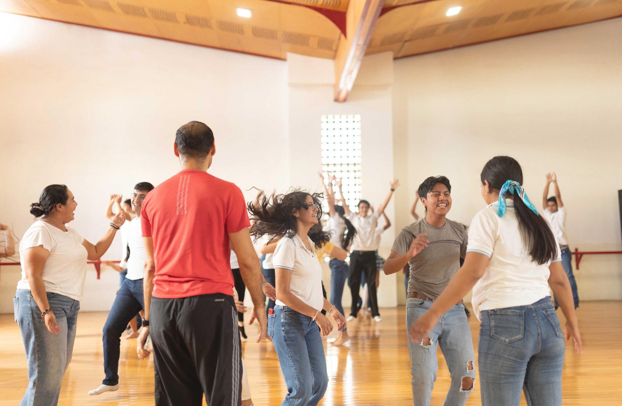 Más adelante, los directores de la Compañía Univerdanza, Adriana León y Alejandro Vera, recibieron a los estudiantes en el Salón “Guillermina Bravo” del Departamento de Música, donde trabajaron con ellos y ellas el “Laboratorio performance DANZA Y HUMANIDAD”. Al final, 40 voluntarios de este plantel participaron en un ejercicio coreográfico guiado por estos maestros y bailarines universitarios.
