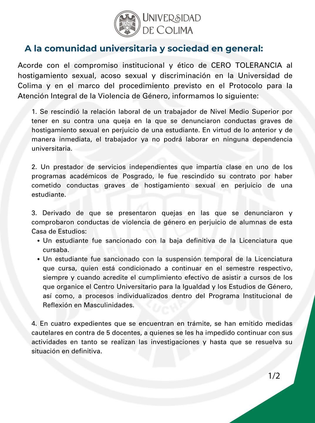 Por otro lado, la Universidad de Colima informa que en 4 expedientes abiertos y que se encuentran en trámite, se han emitido medidas cautelares en contra de 5 docentes a quienes se les ha impedido continuar con sus actividades en tanto culminen las investigaciones.
