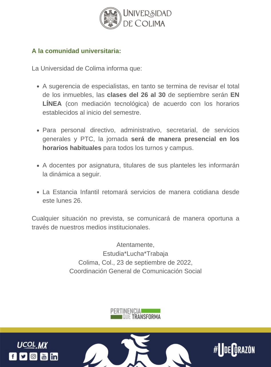 En un comunicado, la Universidad de Colima informó que de la semana del lunes 26 al viernes 30 de septiembre, las clases serán en línea, bajo mediación tecnológica, para permitir que se complete el proceso de revisión de los espacios y planteles universitarios, tras el sismo de magnitud 7.7 y sus posteriores réplicas.