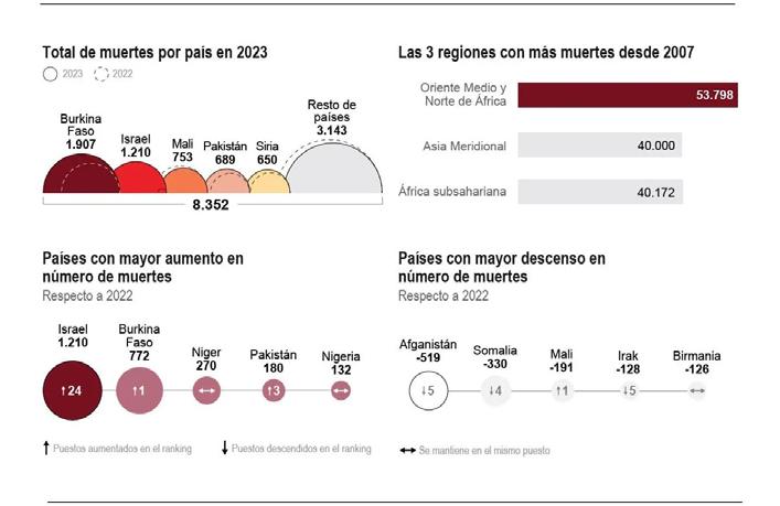 El incidente terrorista más mortífero de 2023 fue el ataque perpetrado por Hamas en Israel el 7 de octubre, en el que murieron 1,200 personas, pero sus consecuencias han tenido tal impacto que, a mediados de este febrero, más de 30 mil palestinos han perdido la vida en la operación militar de Israel en la Franja de Gaza, agrega.