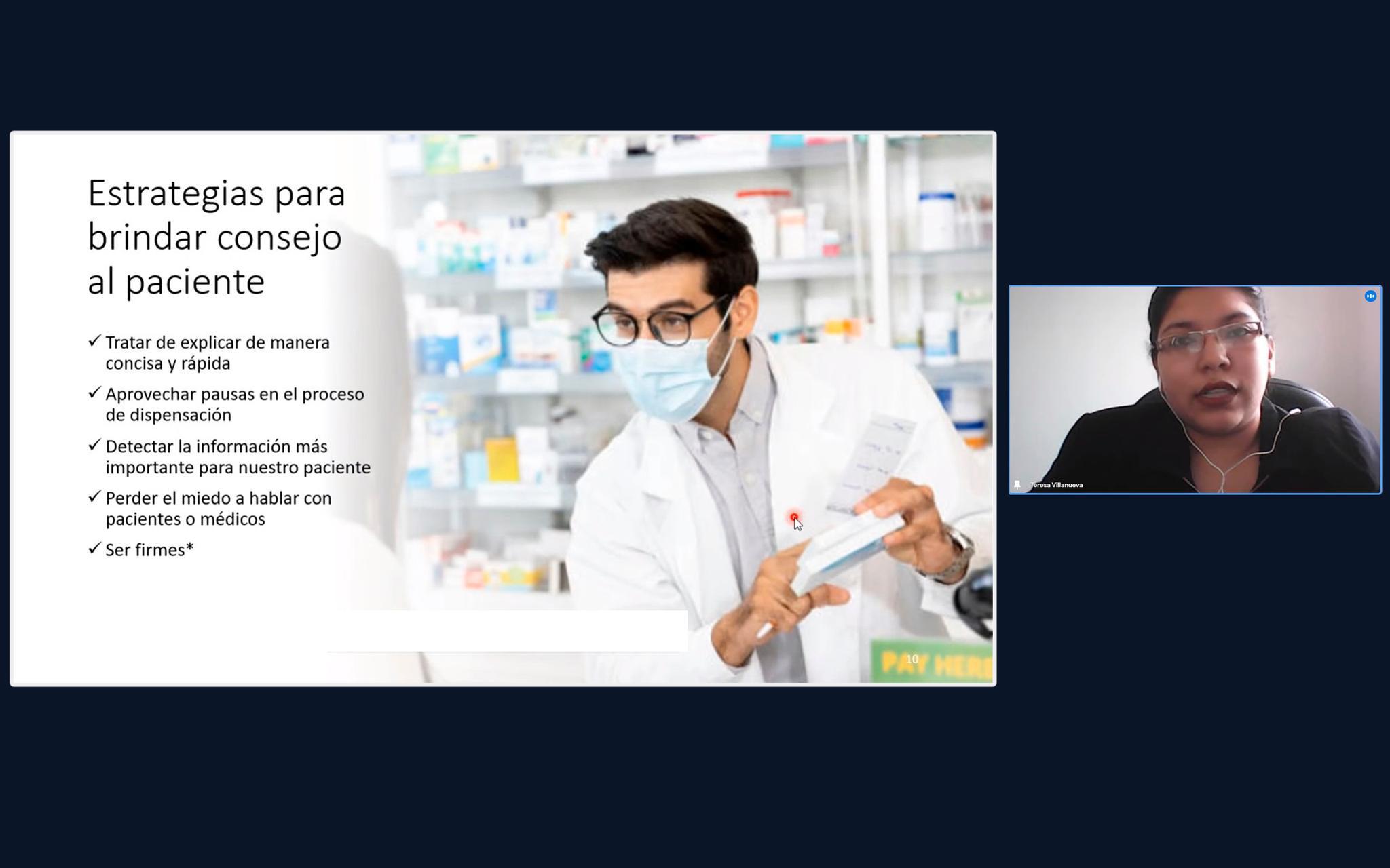 En su charla “Farmacias comunitarias: un espacio para realizar intervenciones farmacéuticas”, María Teresa Villanueva dijo que las y los farmacéuticos son quienes se aseguran de que un medicamento sea seguro, efectivo y eficiente mediante la revisión de la preinscripción. Además, deben asegurarse de que el producto no sea falsificado; esto es, que el proveedor cumpla con los requerimientos sanitarios y el producto esté 100% aprobado para su venta.