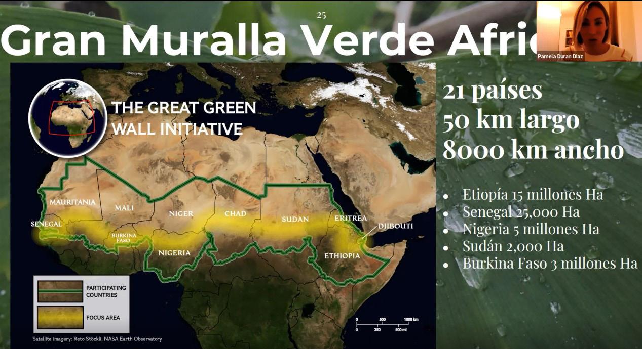 Por último, habló del proyecto de la gran muralla verde africana, en la que 21 países colaboran en la reforestación de 8 mil kilómetros de largo y 15 de ancho: “Esta iniciativa busca transformar la vida de millones de personas creando un mosaico de paisajes verdes y productivos”.