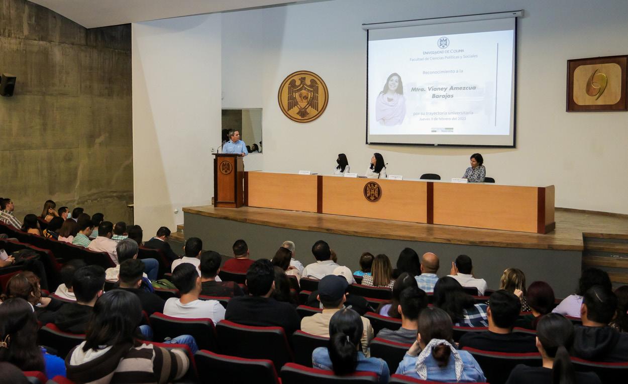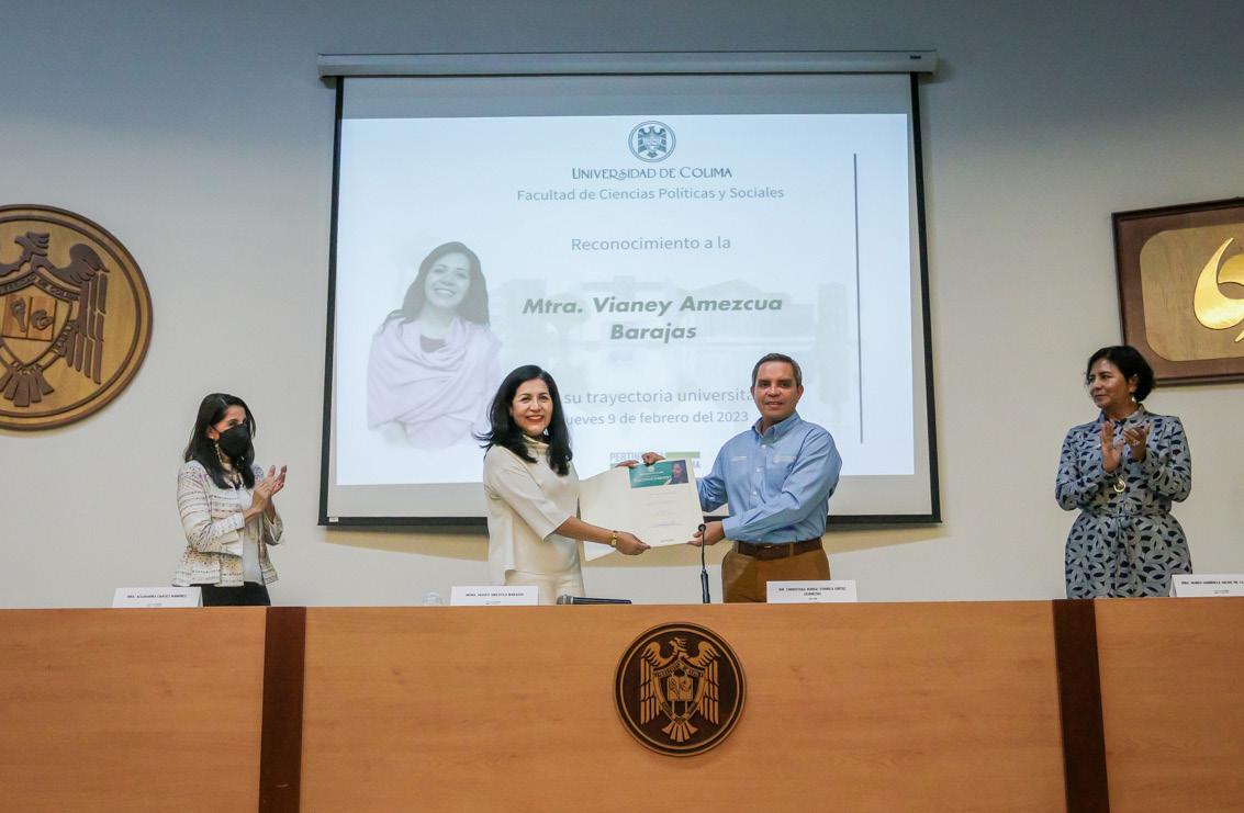 Emotiva y cálida fue la ceremonia de reconocimiento, por sus más de 30 años de trabajo en la Universidad de Colima, que la Facultad de Ciencias Políticas y Sociales le rindió a la maestra Vianey Amezcua Barajas, quien estuvo acompañada por familiares, amigos, colegas y estudiantes.