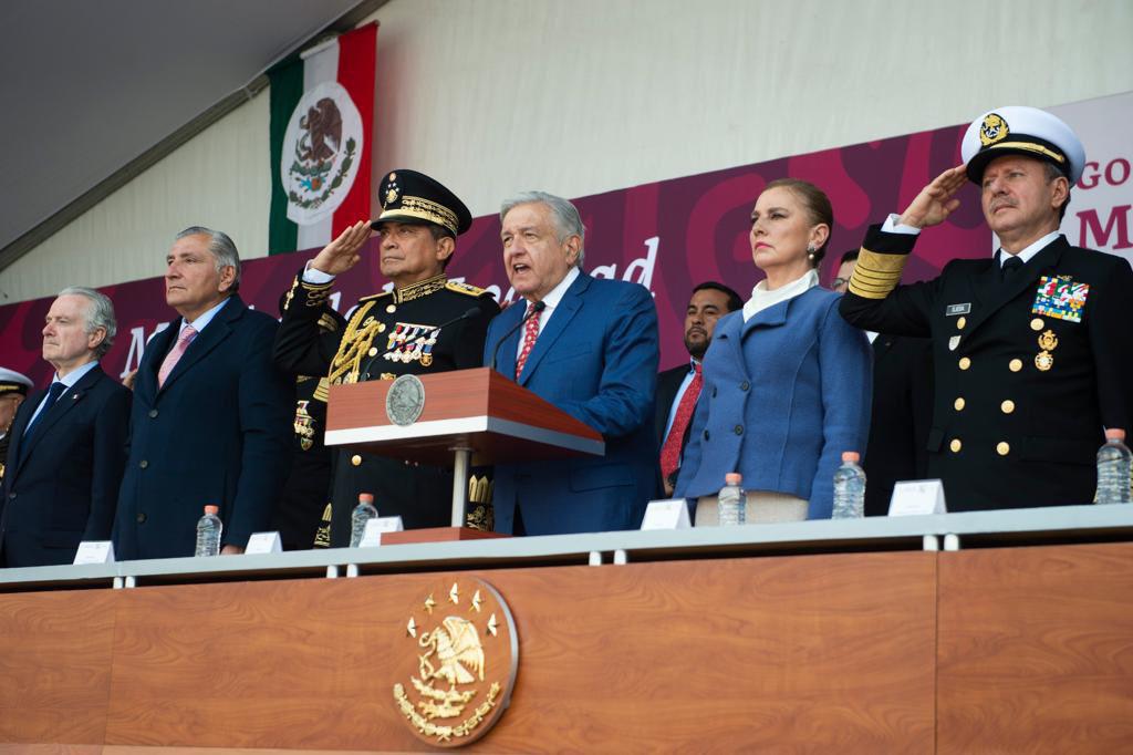 El presidente viajó en el vehículo militar junto a Sandoval y Ojeda, mientras que atrás, en un automotor similar, se transportaron los legisladores, la Ministra Piña y Gutiérrez Müller.