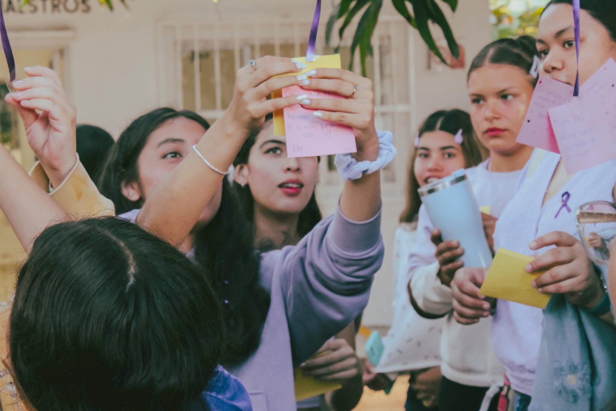 Para finalizar, las asistentes hicieron un ejercicio de reflexión y escribieron palabras dedicadas a otra mujer. Estos mensajes en papel formaron una cortina de hilos morados. Posteriormente, cada una de ellas tomó una de las frases que otra persona había escrito para llevársela a casa.