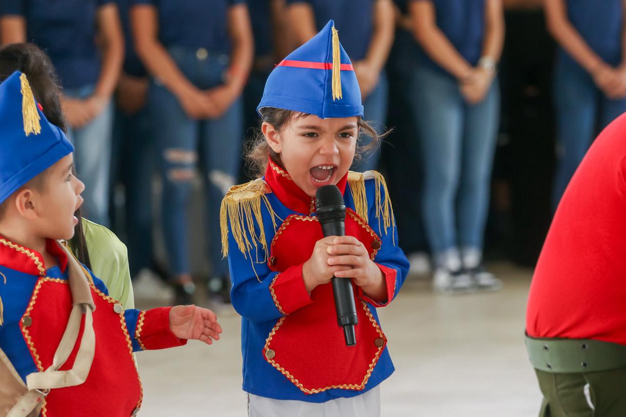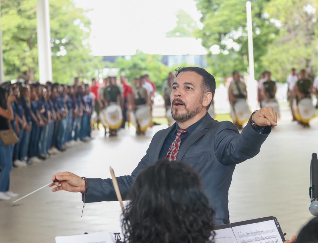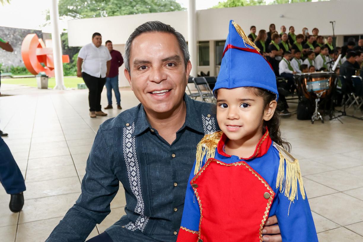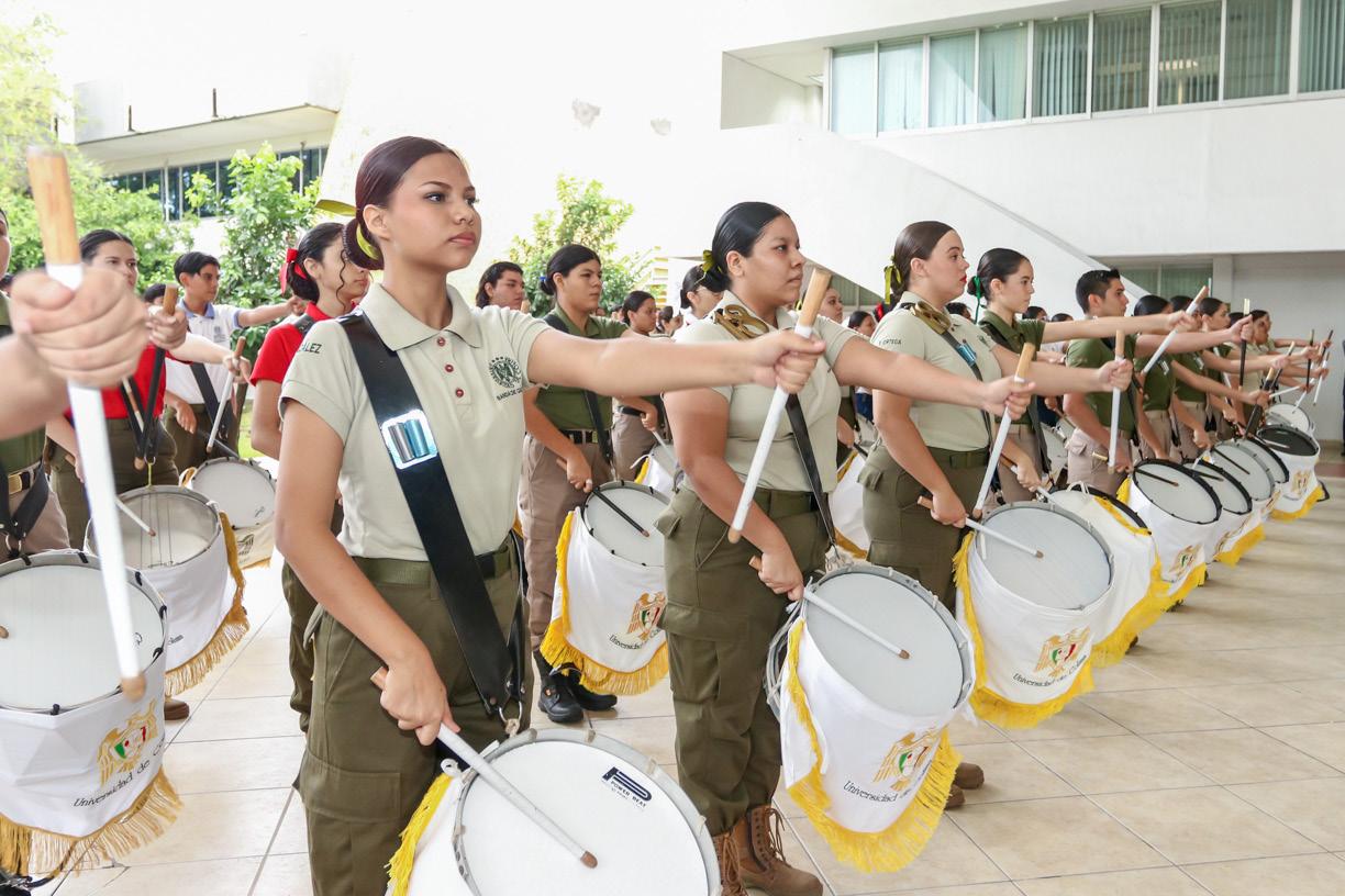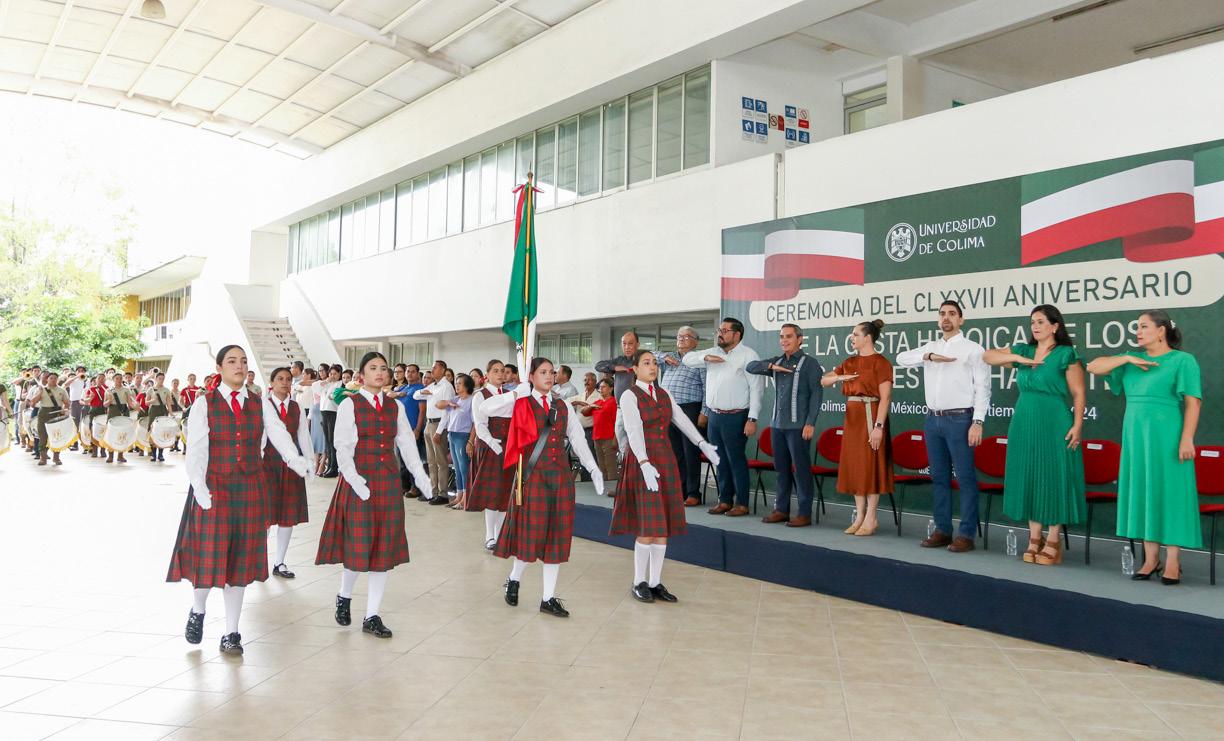 participación de los niños de la Estancia Infantil de la UdeC. Llamaron la atención, por su entusiasmo y entrega, las y los integrantes de una gran banda de guerra conformada por estudiantes de los bachilleratos 1, 2, 4, 13, 15, 17, 18, 25 y 34. Gran parte de la organización y desarrollo de la ceremonia estuvo a cargo de docentes y alumnos de la Facultad de Ciencias de la Educación. Para cerrar esta ceremonia cívica, se entonó el himno universitario por parte del Coro de la UdeC, la Banda Sinfónica y el Coro de los Niños Cantores de la Universidad de Colima, bajo la dirección de los maestros José Antonio Frausto Zamora y Gabriel Frausto Zamora.
