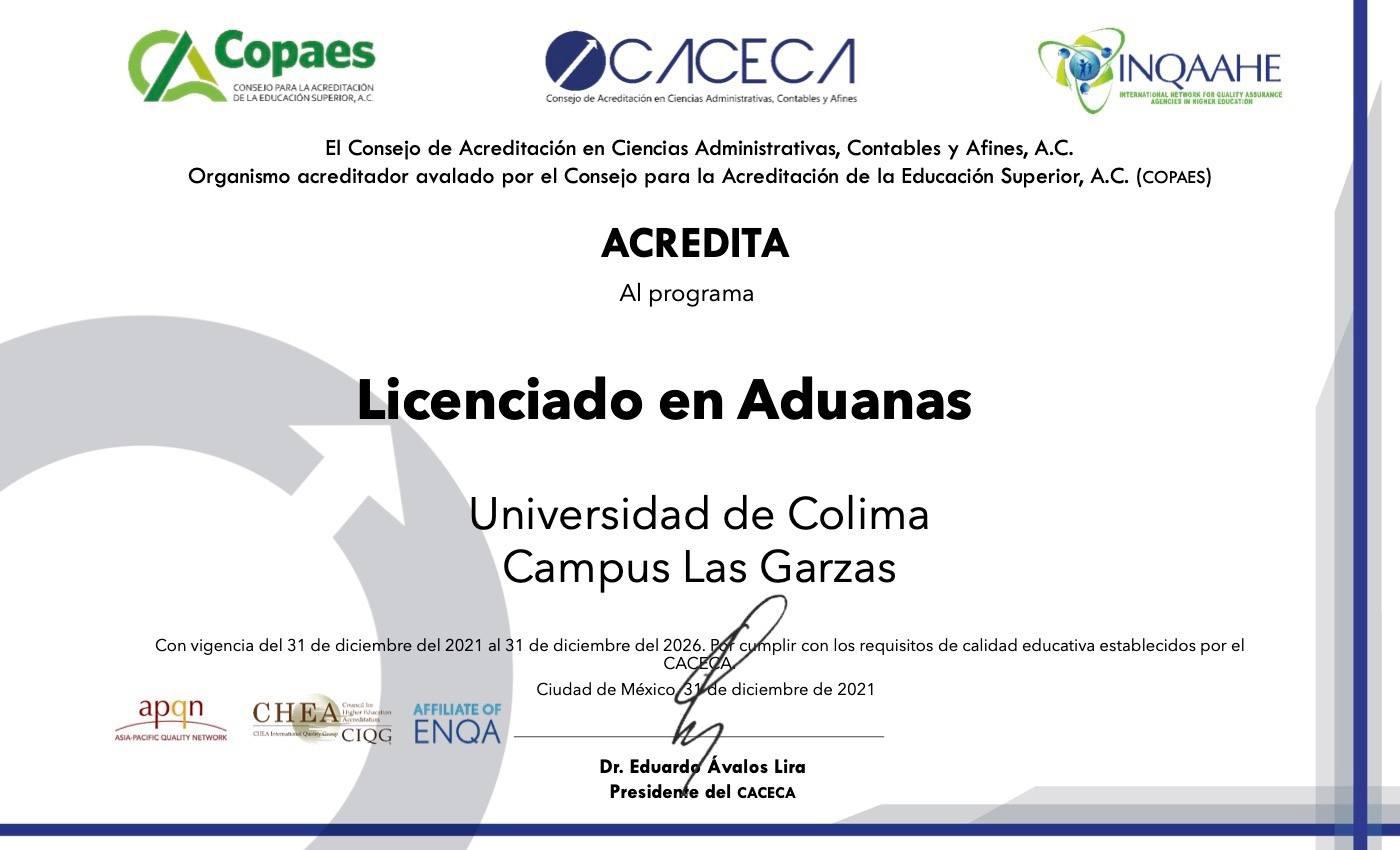 La Universidad de Colima recibió la acreditación de su programa de Licenciatura en Aduanas que se imparte en la Facultad de Comercio Exterior del campus Valle de las Garzas, en Manzanillo. Este programa fue avalado por el CaCeCa como un programa de calidad, y acreditado por segunda vez en 5 años.