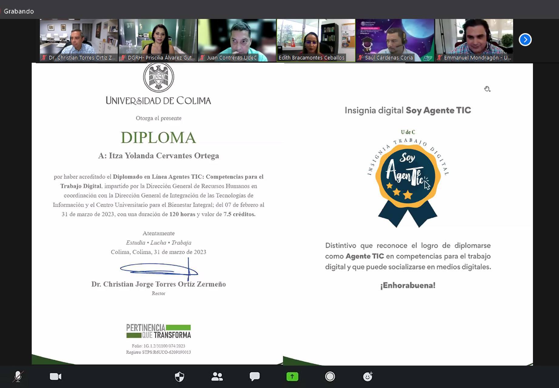En ceremonia virtual, la Universidad de Colima entregó los primeros diplomas digitales de su historia, durante la clausura del segundo Diplomado en línea de Competencias para el Trabajo Digital Agentes TIC, en el que participaron 394 trabajadores de las 5 delegaciones universitarias. También recibieron una insignia digital que les permitirá identificarse como Agentes TIC
