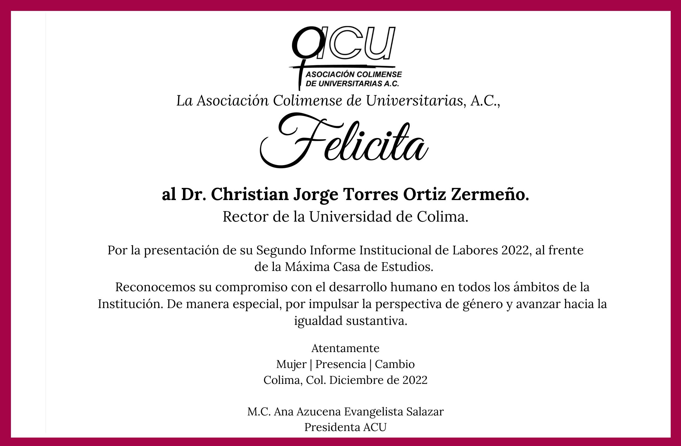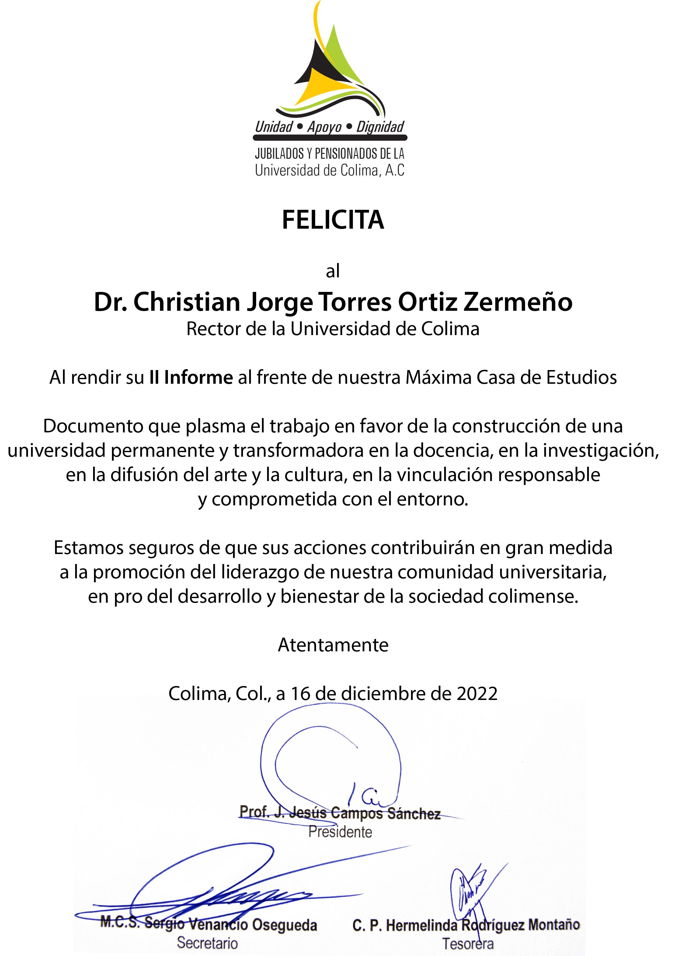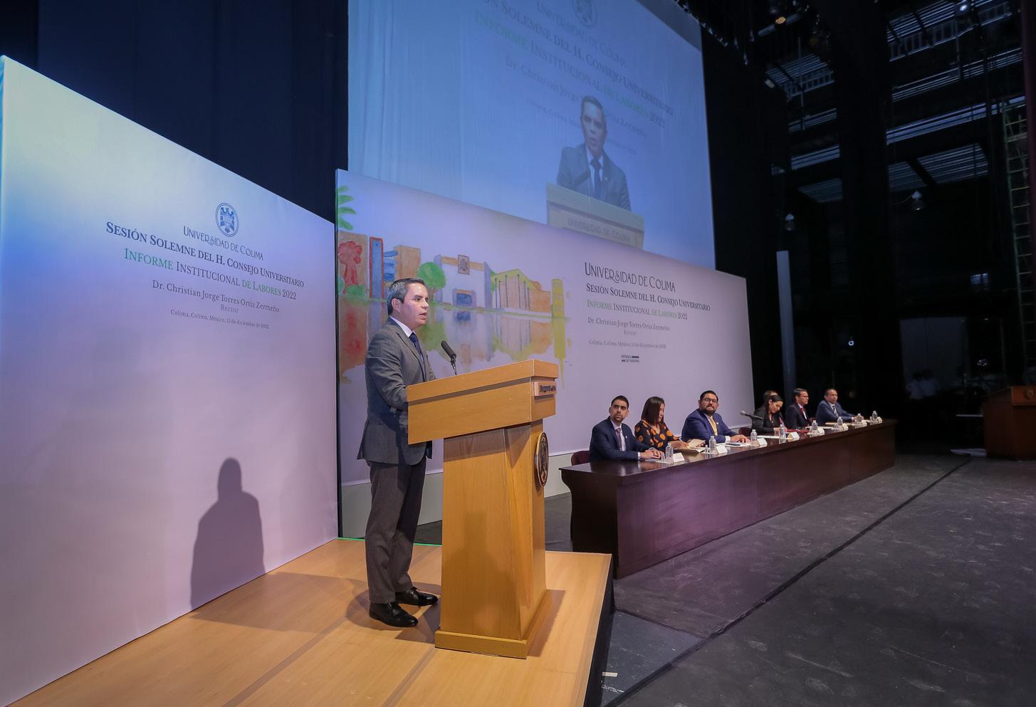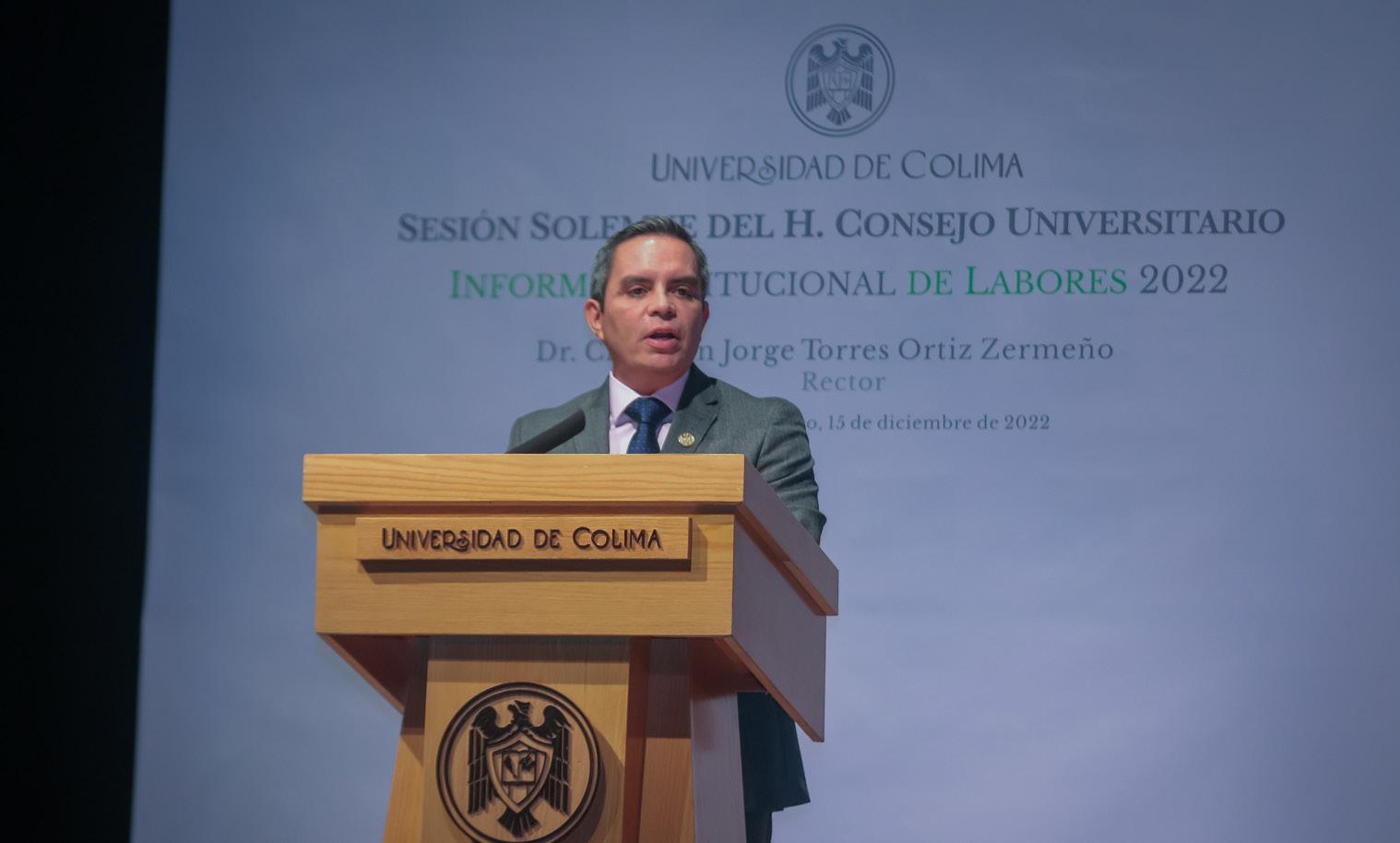 l rendir su segundo informe de labores ante el Consejo Universitario, máximo órgano de gobierno de la Universidad de Colima, este jueves (15) por la mañana en el Teatro Universitario, el Rector Christian Jorge Torres Ortiz Zermeño aseguró que los problemas de la sociedad son retos para esta Casa de Estudios; “por eso, a lo largo de su historia, nuestra Universidad ha atendido esos desafíos con intenso trabajo en equipo, con dedicación, con inteligencia y con respeto a las diversas instancias con las que interactuamos”.