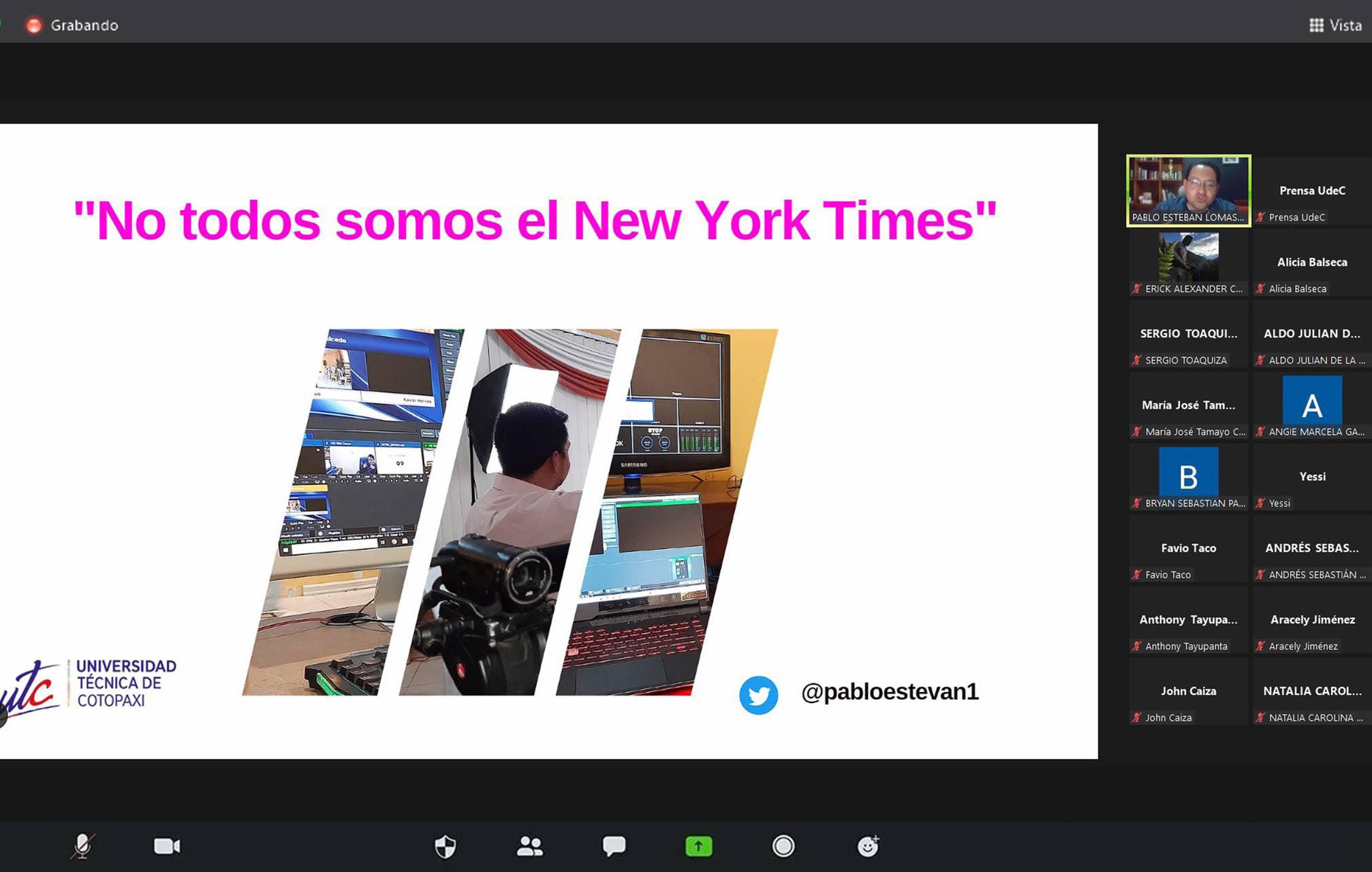 La Universidad de Colima, a través de la Facultad de Letras y Comunicación y la Red de Investigadores en Periodismo, realizaron el webinar “Medios locales de impacto desde Ecuador: tips para conquistar grandes audiencias desde las iniciativas comunicacionales emergentes”, a cargo de Pablo Lomas Chacón. Lo anterior como parte de las actividades del Seminario Internacional de Estudios sobre Periodismo. En su charla, Lomas Chacón mencionó algunos consejos que considera importantes y compartió sus experiencias, tomando en cuenta que en la actualidad los medios de comunicación son, en su mayoría, digitales. Así, explicó la manera de construir audiencias o comunidades: “Los primero es anticiparse, actuar en un escenario donde todo funciona de manera opuesta a lo que se conoce; en segundo lugar, el mundo adopta la morfología de la red, es decir, se ha de crear el propio sistema de nodos con colegas, medios, etcétera”.