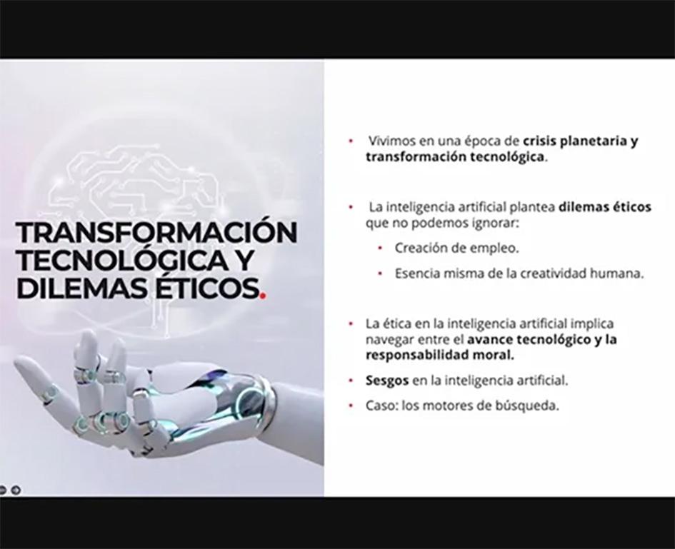 nos y la tecnología, ya que ésta es una herramienta que los seres humanos deben utilizar para transformar su entorno y mejorar su calidad de vida”. Para cerrar, recomendó que las universidades “deben proporcionar a los estudiantes herramientas prácticas para abordar dilemas éticos en el diseño y la implementación de las tecnologías”.
