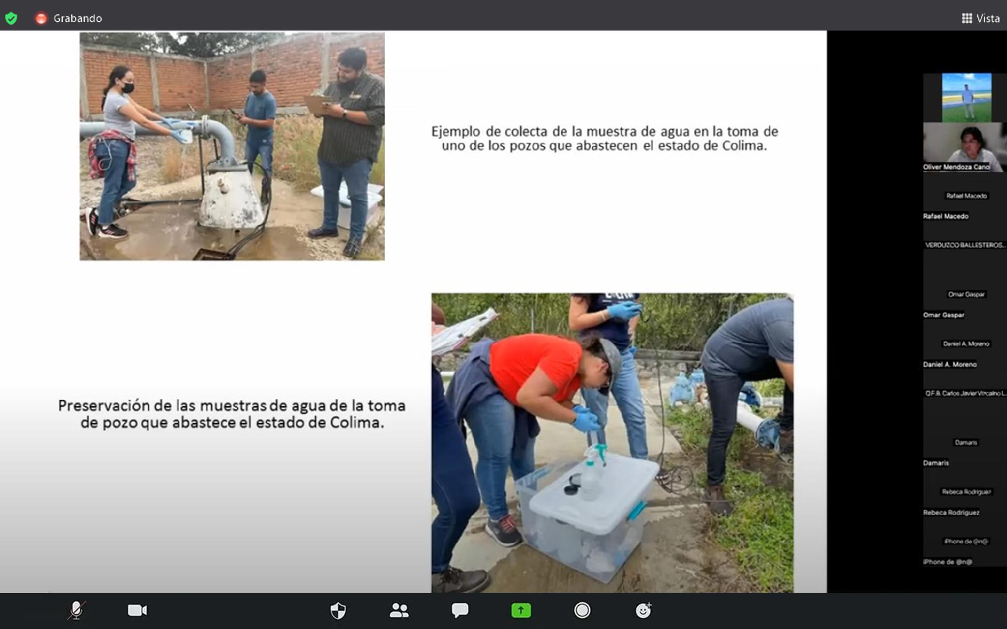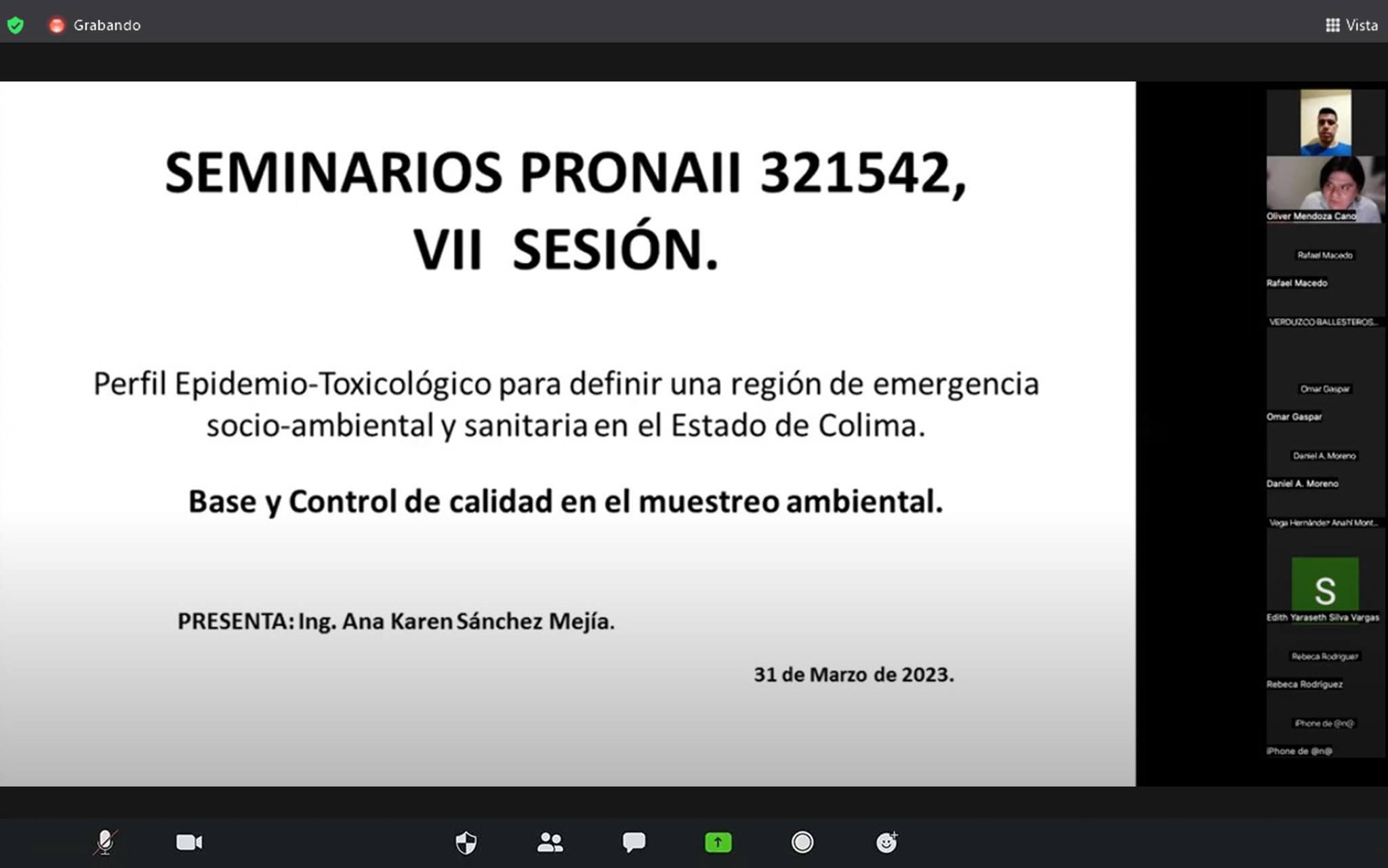 Como parte de los seminarios virtuales que se realizan en un proyecto científico de alcances nacionales que busca definir una región de emergencia socioambiental y sanitaria en el estado de Colima, Rebeca Yasmín Pérez Rodríguez habló sobre la importancia del monitoreo ambiental y Ana Karen Sánchez Mejía explicó las bases y el control de calidad en el muestreo ambiental. El proyecto se titula “Fortalecimiento de la infraestructura para atender problemas de contaminación en la región occidente del país, para reforzar el PRONACES, así como para robustecer y consolidar la investigación toxicológica en México”, lo encabeza el Doctor Oliver Mendoza Cano, investigador de la Facultad de Ingeniería Civil de la Universidad de Colima y es apoyado por el ahora Consejo Nacional de Humanidades, Ciencia y Tecnología (Conahcyt) me -
