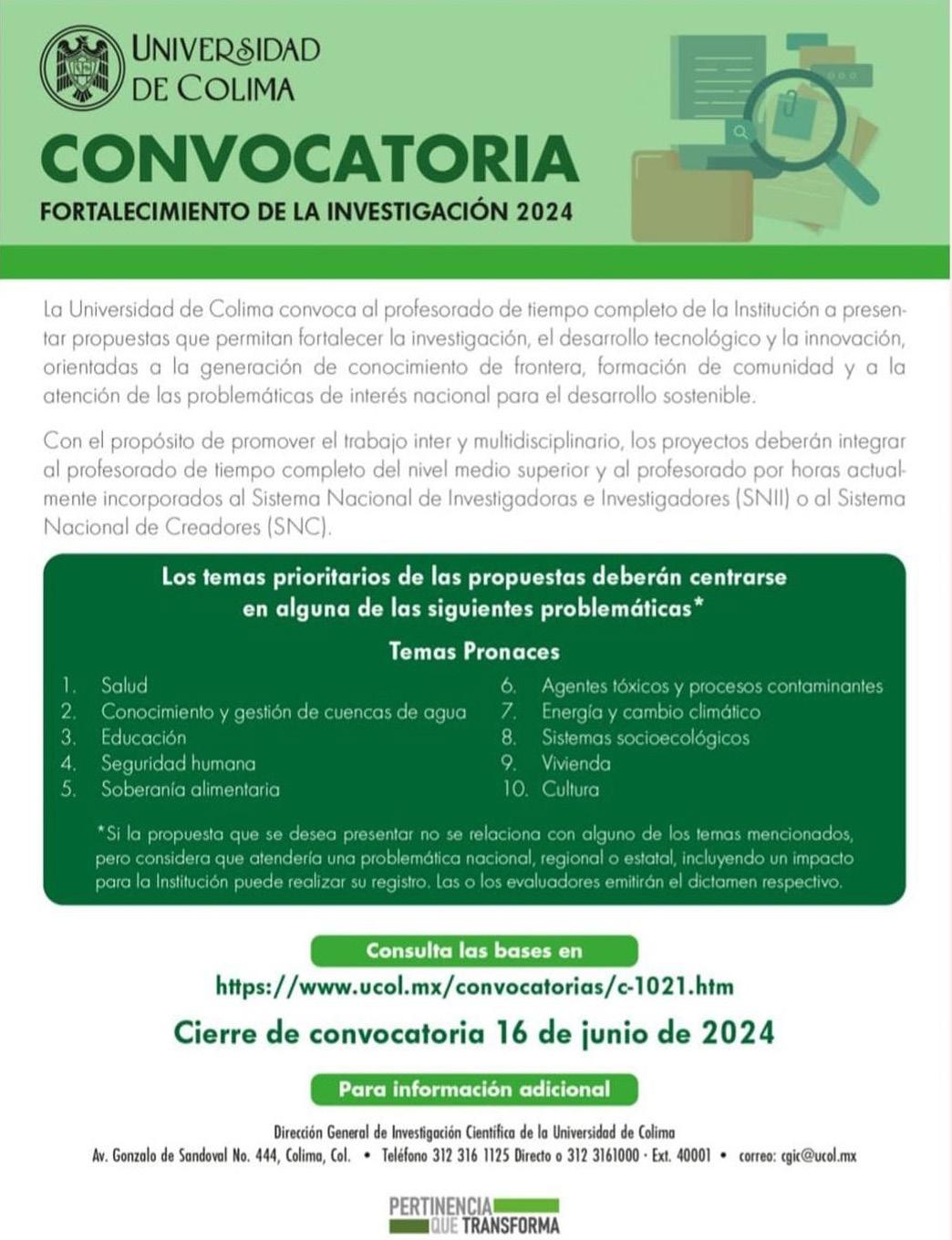 Para mayores informes de la convocatoria, favor de comunicarse a la Coordinación General de Investigación, al correo electrónico: cgic@ ucol.mx .