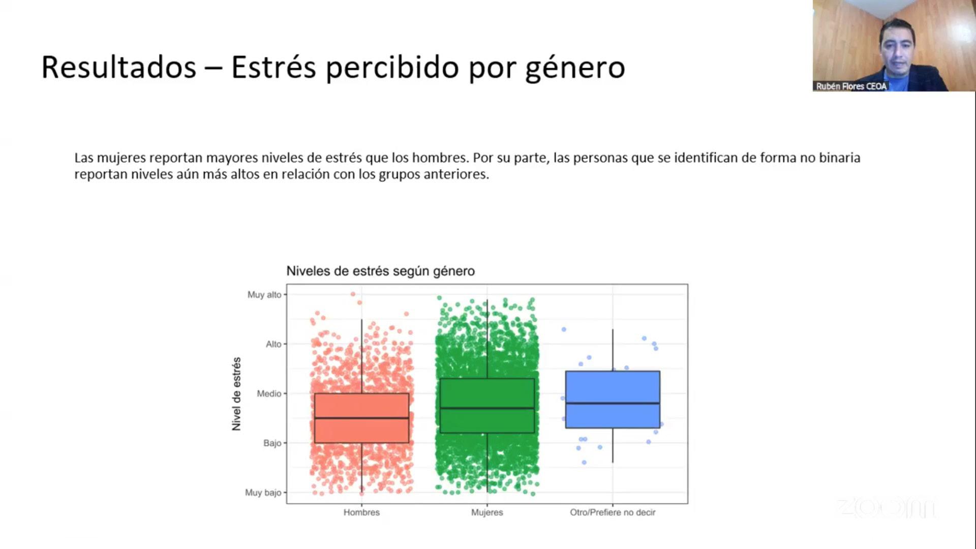 Otro aspecto que resaltó durante su conferencia es que, en comparación internacional, México se ubicó en niveles de estrés intermedio durante la pandemia, siendo la economía nacional la principal causa y no el contagio. Quizás, dijo, “pasar tiempo en casa con la familia ayudó, al igual que las redes sociales y el uso de video juegos”. Sin embargo, también se percataron de que las mujeres, en especial las madres de familia, tenían menos privacidad que el resto de la familia.
