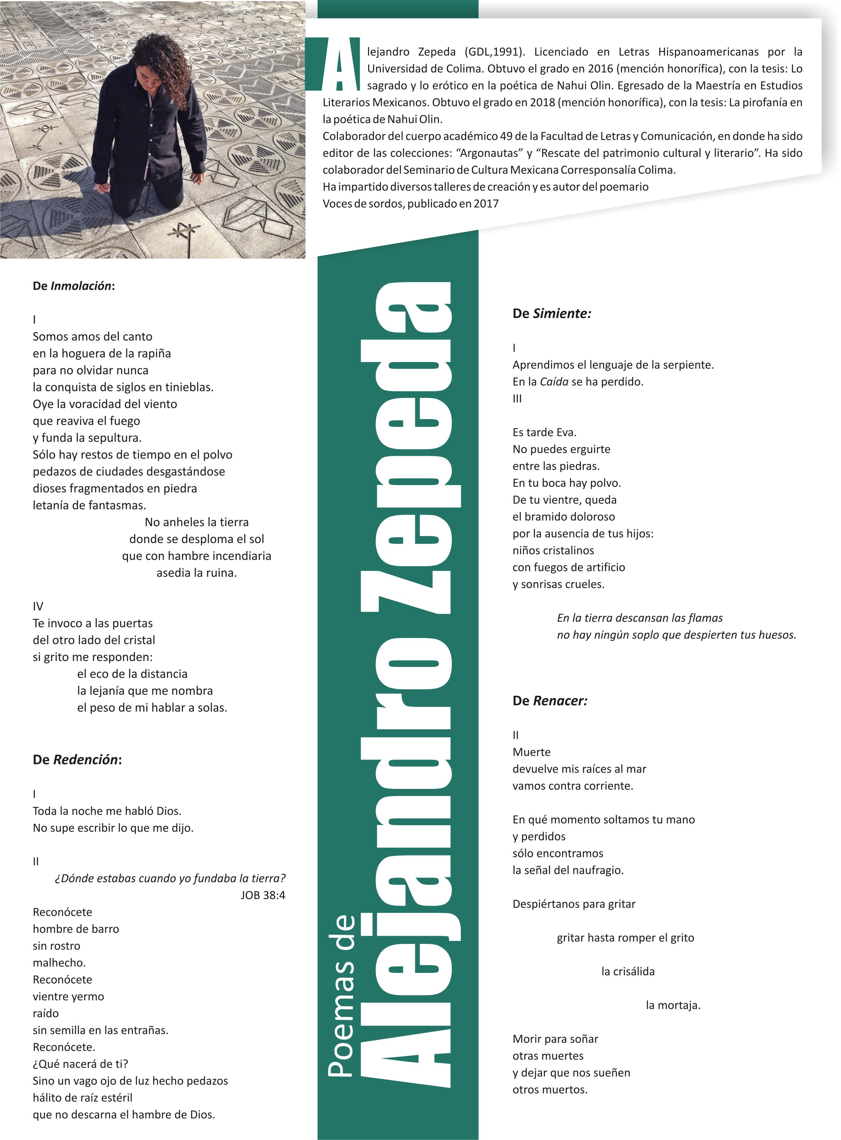 Pablo Piceno, nacido en Wolfsburg, Alemania en 1990, nos entrega esta obra que le hizo merecedor del Premio Poesía Joven Elías Nandino 2018, que en unas páginas resulta fragmentos de un libro de historia y otras, testimonios de las víctimas. En un punto, sin atribuirlo a una de las voces, alude a la pérdida del orden de la historia y será más bien a las versiones que hacen de la historia lo más cercano a la verdad.