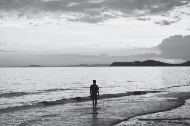 La botella se terminó. Él se puso de pie y caminó hacia el mar. Nadó más allá de donde rompen las olas y se recostó en el agua para flotar. Con tal de no dejarlo solo, ella le siguió los pasos.