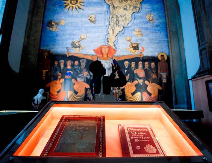 Vista de la “Constitución Política de los Estados Unidos Mexicanos de 1917” que integra la exposición “La grandeza de México” inaugurada este 1 de octubre en el Salón Iberoamericano, del edificio de la Secretaría de Educación Pública, en la Ciudad de México (EFE).