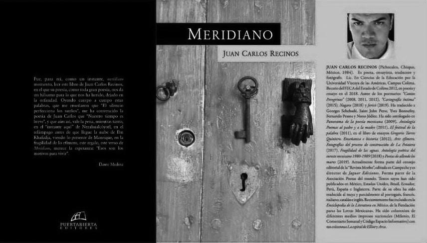 En Meridiano , su libro más reciente, Juan Carlos Recinos se adentra en la exploración de la naturaleza y la medida del tiempo. Con cuánta sed, con cuánta fe y empeño, el poeta de Colima busca, como el santo de Hipona, alguna señal que le revele el misterio. Dice: Puedo definir la palabra tiempo y enmudecer. Él sabe , como Agustín, qué es el tiempo porque lo percibe en su paso insobornable sobre todo lo vivo y lo inerte, en las ruinas y en el amor, en las despojos de éste, es decir, en la memoria feliz y en el recuerdo doloroso del pasado que acompaña a los amantes; en la mirada de asombro del niño, en las palabras y en las arrugas de su abuela y de su madre. En suma, en lo que vive y muere todos los días sin remedio a nuestro alrededor. Lo que no sabe , como el propio Agustín, es cómo explicarlo cuando le preguntan o cuando se pregunta ¿qué es, qué diablos es el tiempo?