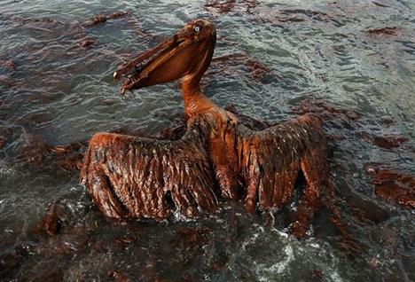 Pelicano afectado por el derrame de petróleo en la costa de Luisiana E.U. Tomado de https://www.mirror.co.uk/news
